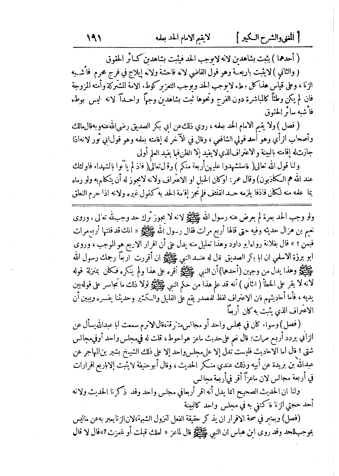 فبمن؟) قال بفلانة رواه أبو داود وهذا تعليل منه يدل على أن إقرار الأربع هو الموجب، وروى أبو برزة الأسلمي أن أبا بكر الصديق قال له عند النبي صلى الله عليه وسلم إن أقررت أربعاً رجمك رسول الله صلى الله عليه وسلم وهذا يدل من وجهين (أحدهما) أن النبي صلى الله عليه وسلم أقره على هذا ولم ينكره فكان بمنزلة قوله لأنه لا يقر على الخطأ (الثاني) أنه قد علم هذا من حكم النبي صلى الله عليه وسلم لولا ذلك ما تجاسر على قوله بين يديه، فأما أحاديثهم فإن الاعتراف لفظ للمصدر يقع على القليل والكثير وحديثنا يفسره ويبين أن الاعتراف الذي يثبت به كان أربعاً (فصل) وسواء كان في مجلس واحد أو مجالس متفرقة، قال الأثرم سمعت أبا عبد الله يسأل عن الزاني يردد أربع مرات؟ قال نعم على حديث ماعز هو أحوط، قلت له في مجلس واحد أو في مجالس شتى؟ قال أما الأحاديث فليست تدل إلا على مجلس واحد إلا على ذلك الشيخ بشير بن المهاجر عن عبد الله بن بريدة عن أبيه وذلك عندي منكر الحديث، وقال أبو حنيفة لا يثبت إلا بأربع إقرارات في أربعة مجالس لأن ماعزاً أقر في أربعة مجالس ولنا أن الحديث الصحيح إنما يدل أنه أقر أربعاً في مجلس واحد وقد ذكرنا الحديث ولأنه أحد حجتي الزنا فاكتفي به في مجلس واحد كالبينة (فصل) ويعتبر في صحة الإقرار أن يذكر حقيقة الفعل لتزول الشبهة، لأن الزنا يعبر به عن ما ليس بموجب للحد وقد روى ابن عباس أن النبي صلى الله عليه وسلم قال لماعز (لعلك قبلت أو غمزت؟) قال لا قال