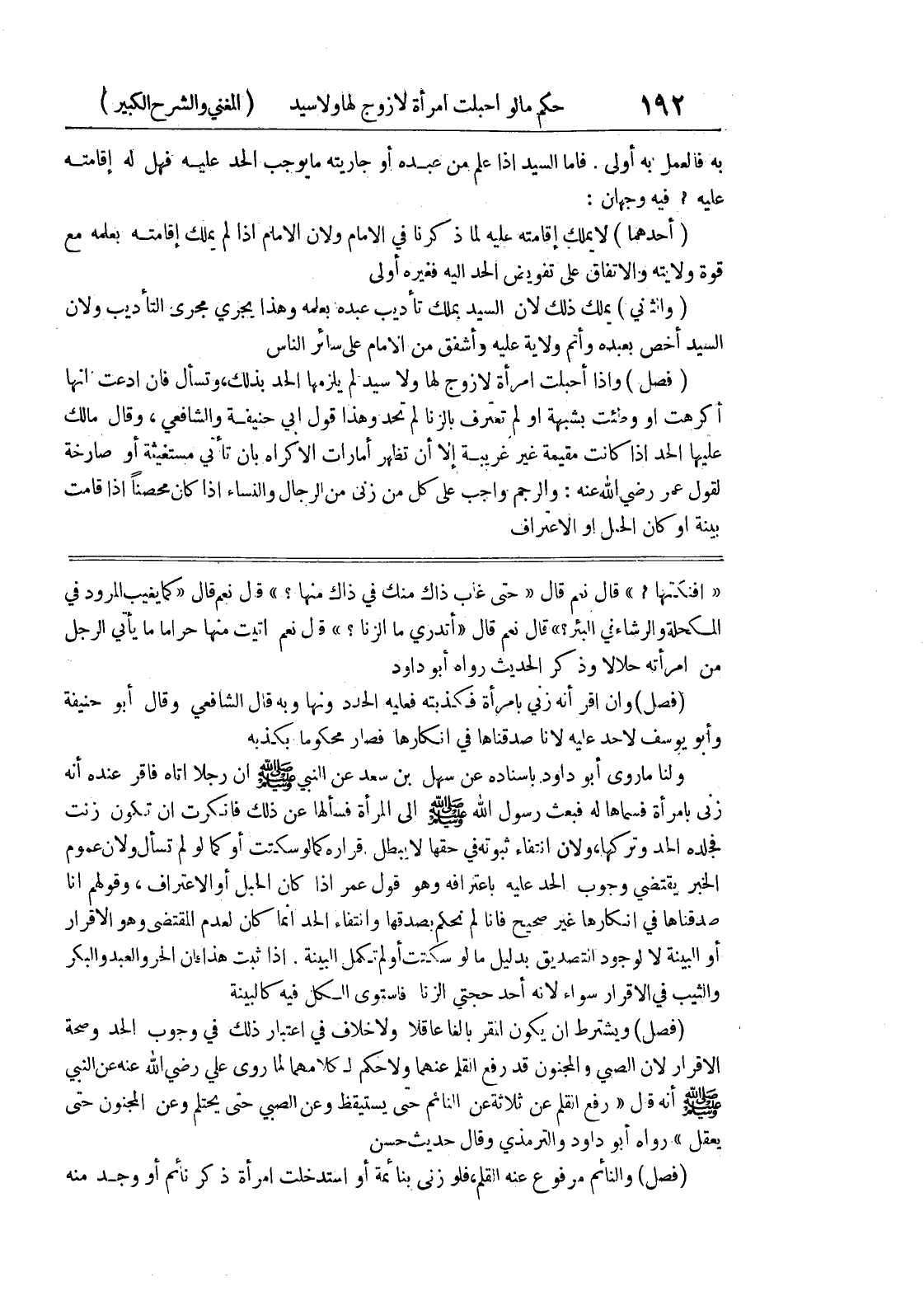 إذا ثبت هذا فإن الحر والعبد والبكر والثيب في الإقرار سواء لأنه أحد حجتي الزنا فاستوى الكل فيه كالبينة (فصل) ويشترط أن يكون المقر بالغا عاقلا ولا خلاف في اعتبار ذلك في وجوب الحد وصحة الإقرار لأن الصي والمجنون قد رفع القلم عنهما ولا حكم لكلامهما لما روى علي رضي الله عنه عن النبي صلى الله عليه وسلم أنه قال (رفع القلم عن ثلاثة عن النائم حتى يستيقظ وعن الصبي حتى يحتلم وعن المجنون حتى يعقل) رواه أبو داود والترمذي وقال حديث حسن (فصل) والنائم مرفوع عنه القلم، فلو زنى بنائمة أو استدخلت امرأة ذكر نائم أو وجد منه