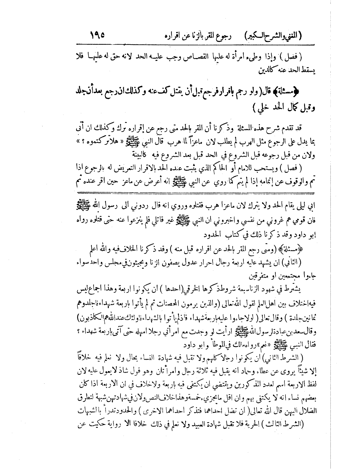 أبي ليلى يقام الحد ولا يترك لأن ماعزا هرب فقتلوه وروي أنه قال ردوني إلى رسول الله صلى الله عليه وسلم فان قومي هم غروني من نفسي وأخبروني أن النبي صلى الله عليه وسلم غير قاتلي فلم ينزعوا عنه حتى قتلوه رواه أبو داود وقد ذكرنا ذلك في كتاب الحدود (مسألة) (ومتى رجع المقر بالحد عن إقراره قبل منه) وقد ذكرنا الخلاف فيه والله أعلم (الثاني) أن يشهد عليه أربعة رجال أحرار عدول يصفون الزنا ويجيئون في مجلس واحد سواء جاءوا مجتمعين أو متفرقين يشترط في شهود الزنا سبعة شروط ذكرها الخرقي (احدها) أن يكونوا أربعة وهذا إجماع ليس فيه اختلاف بين أهل العلم لقول الله تعالى (والذين يرمون المحصنات ثم لم يأتوا بأربعة شهداء فاجلدوهم ثمانين جلدة) وقال تعالى (لولا جاءوا عليه بأربعة شهداء فإذ لم يأتوا بالشهداء فأولئك عند الله هم الكاذبون) وقال سعد بن عبادة لرسول الله صلى الله عليه وسلم ارأيت لو وجدت مع امرأتي رجلا امهله حتى آتي بأربعة شهداء؟ فقال النبي صلى الله عليه وسلم (نعم) رواه مالك في الموطأ وابو داود (الشرط الثاني) أن يكونوا رجالاً كلهم ولا تقبل فيه شهادة النساء بحال ولا نعلم فيه خلافاً إلا شيئاً يروى عن عطاء وحماد أنه يقبل فيه ثلاثة رجال وامرأتان وهو قول شاذ لا يعول عليه لأن لفظ الأربعة اسم لعدد المذكورين ويقتضي أن يكتفى فيه بأربعة ولا خلاف في أن الاربعة إذا كان بعضهم نساء أنه لا يكتفى بهم وإن أقل ما يجزئ خمسة وهذا خلاف النص ولأن في شهادتهن شبهة لتطرق الضلال اليهن قال الله تعالى (أن تضل إحداهما فتذكر إحداهما الأخرى) والحدود تدرأ بالشبهات (الشرط الثالث) الحرية فلا تقبل شهادة العبيد ولا نعلم في ذلك خلافاً إلا رواية حكيت عن