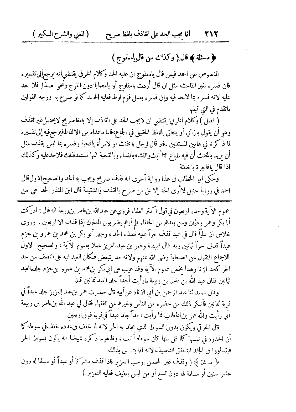 وروى خلاس ان عليا قال في عبد قذف حراً عليه نصف الحد، وجلد أبو بكر بن محمد بن عمرو بن حزم عبداً قذف حراً ثمانين وبه قال قبيصة وعمر بن عبد العزيز عملا بعموم الآية، والصحيح الأول للاجماع المنقول عن الصحابة رضي الله عنهم ولأنه حد يتبعض فكان العبد فيه على النصف من حد الحر كحد الزنا وهذا يخص عموم الآية وقد عيب على أبي بكر بن محمد بن عمرو بن حزم جلده العبد ثمانين فقال عبد الله بن عامر بن ربيعة ما رأيت أحداً جلد العبد ثمانين قبله وقال سعيد ثنا عبد الرحمن بن أبي الزناد عن أبيه قال حضرت عمر بن عبد العزيز جلد عبداً في فرية ثمانين فأنكر ذلك من حضره من الناس وغيرهم من الفقهاء فقال لي عبد الله بن عامر بن ربيعة إني رأيت والله عمر بن الخطاب فما رأيت أحداً جلد عبداً في فرية فوق أربعين قال الخرقي ويكون بدون السوط الذي يجلد به الحر لأنه لما خفف في عدده خفف في سوطه كما أن الحدود في نفسها كلما قل منها كان سوطه أخف، وظاهر ما ذكره شيخنا أنه يكون بسوط الحر فيتساووا في الجلد ليتحقق التنصيف لأنه إنما يتحقق بذلك (مسألة) (وقذف غير المحصن يوجب التعزير فاذا قذف مشركاً أو عبداً أو مسلماً له دون عشر سنين أو مسلمة لها دون تسع أو من ليس بعفيف فعليه التعزير)