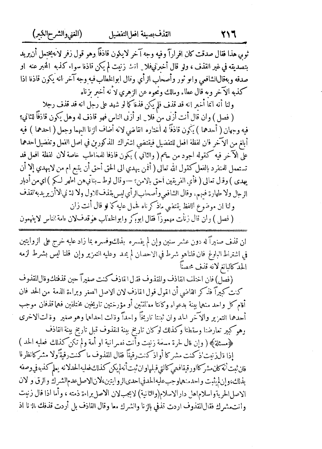 إن قذف صغيراً له دون عشر سنين وإن لم يفسره بذلك وفسره بما زاد عليه خرج على الروايتين في اشتراط البلوغ فان قلنا هو شرط في الإحصان لم يحد وعليه التعزير وإن قلنا ليس بشرط لزمه الحد كالبالغ لأنه قذف محصناً (فصل) فان اختلف القاذف والمقذوف فقال القاذف كنت صغيراً حين قذفتك وقال المقذوف كنت كبيراً فذكر القاضي أن القول قول القاذف لأن الاصل الصغر وبراءة الذمة من الحد فإن أقام كل واحد منهما بينة بدعواه وكانتا مطلقتين أو مؤرختين تاريخين مختلفين فهما قذفان موجب أحدهما التعزير والآخر الحد وإن ثبنتا تاريخاً واحداً وقالت إحداهما وهو صغير وقالت الأخرى وهو كبير تعارضتا وسقطتا وكذلك لو كان تاريخ بينة المقذوف قبل تاريخ بينة القاذف (مسألة) وإن قال لحرة مسلمة زنيت وانت نصرانية أو أمة ولم تكن كذلك فعليه الحد) إذا قال زنيت إذ كنت مشركا أو إذ كنت رقيقاً فقال المقذوف ما كنت رقيقاً ولا مشركا نظرنا فإن ثبت أنه كان مشركا أو رقيقاً فهي كالتي قبلها وإن ثبت أنه لم يكن كذلك فعليه الحد لأنه يعلم كذبه في وصفه بذلك، وإن لم يثبت واحد منهما وجب عليه الحد في إحدى الروايتين، لأن الأصل عدم الشرك والرق ولأن الأصل الحرية وإسلام أهل دار الاسلام (والثانية) لا يجب لأن الأصل براءة ذمته، وأما اذا قال زنيت وانت مشرك فقال المقذوف اردت قذفي بالزنا والشرك معا وقال القاذف بل أردت قذفك بالزنا إذ