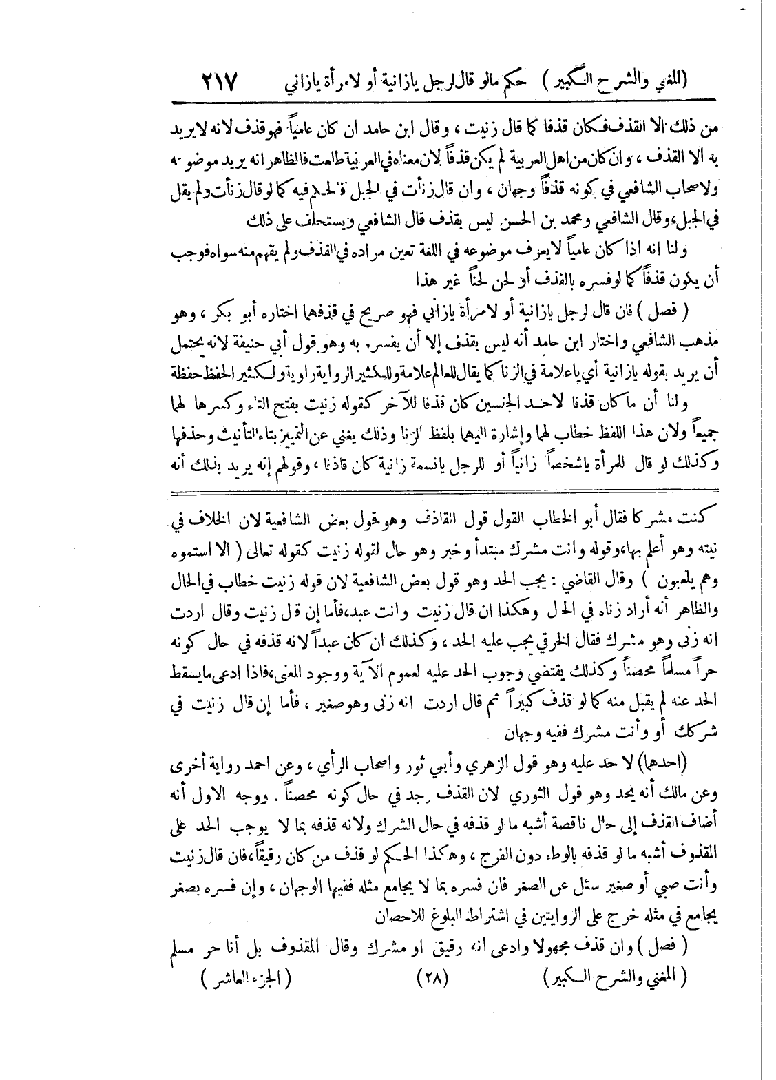 كنت مشركا فقال أبو الخطاب القول قول القاذف وهو قول بعض الشافعية لأن الخلاف في نيته وهو أعلم بها، وقوله وأنت مشرك مبتدأ وخبر وهو حال لقوله زنيت كقوله تعالى (إلا استموه وهم يلعبون) وقال القاضي: يجب الحد وهو قول بعض الشافعية لأن قول زنيت خطاب في الحال والظاهر أنه أراد زناه في الحال وهكذا إن قال زنيت وانت عبد، فأما إن قال زنيت وقال اردت أنه زنى وهو مشرك فقال الخرقي جيب عليه الحد، وكذلك إن كان عبداً لأنه قذفه في حال كونه حراً مسلماً محصناً وكذلك يقتضي وجوب الحد عليه لعموم الآية ووجود المعنى، فإذا ادعى ما يسقط