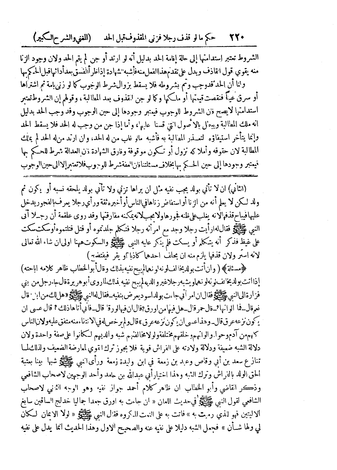 (الثاني) أن لا تأتي بولد يجب نفيه مثل أن يراها تزني ولا تأتي بولد يلحقه نسبه أو يكون ثم ولد لكن لا يعلم أنه من الزنا أو استفاض زناها في الناس أو أخبره ثقة ورأى رجلا يعرف بالفجور يدخل عليها فيباح قذفها لأنه يغلب على ظنه فجورها ولا يجب لأنه يمكنه مفارقتها وقد روى علقمة أن رجلاً أتى النبي صلى الله عليه وسلم فقال له أرأيت رجلا وجد مع امرأته رجلا فتكلم جلدتموه أو قتل قتلتموه أو سكت سكت على غيظ فذكر أنه يتكلم أو يسكت فلم ينكر عليه النبي صلى الله عليه وسلم والسكوت ههنا أولى إن شاء الله تعالى لأنه أستر ولأن قذفها يلزم منه أن يحلف أحدهما كاذبا أو يقر فيفتضح) (مسألة) (وان أتت بولد يخالف لونه لونهما لم يبح نفيه بذلك وقال أبو الخطاب ظاهر كلامه اباحته) إذا أتت بولد يخالف لونه لونهما ويشبه رجلا غير والديه لم يبح نفيه بذلك لما روى أبو هريرة قال جاء رجل من بني فزارة إلى النبي صلى الله عليه وسلم فقال إن امرأتي جاءت بولد أسود يعرض بنفيه - فقال له النبي صلى الله عليه وسلم (هل لك من ابل قال نعم قال - فما الوانها؟ - قال - حمر قال - هل فيها من أورق؟ قال ان فيها لورقا قال - فانى (فانى) أتاها ذلك؟ قال عسى أن يكون نزعه عرق قال - وهذا عسى أن يكون نزعه عرق) قال ولم يرخص له في الانتفاء منه متفق عليه ولأن الناس كلهم من آدم وحواء وألوانهم وخلقهم مختلفة ولولا مخالفتهم شبه والديهم لكانوا على صفة واحدة ولأن دلالة الشبه ضعيفة ودلالة ولادته على الفراش قوية فلا يجوز ترك القوي لمعارضة الضعيف ولذلك لما تنازع سعد بن أبي وقاص وعبد بن زمعة في ابن وليدة زمعة ورأى النبي صلى الله عليه وسلم شبهاً بيناً بعتبة الحق الولد بالفراش وترك الشبه وهذا اختيار أبي عبد الله بن حامد وأحد الوجهين لأصحاب الشافعي وذكر القاضي وأبو الخطاب أن ظاهر كلام أحمد جواز نفيه وهو الوجه الثاني لأصحاب الشافعي لقول النبي صلى الله عليه وسلم في حديث اللعان (إن جاءت به أورق جعدا جماليا خدلج الساقين سابغ الاليتين فهو للذي رميت به) فأتت به على النعت المكروه فقال النبي صلى الله عليه وسلم (لولا الأيمان لكان