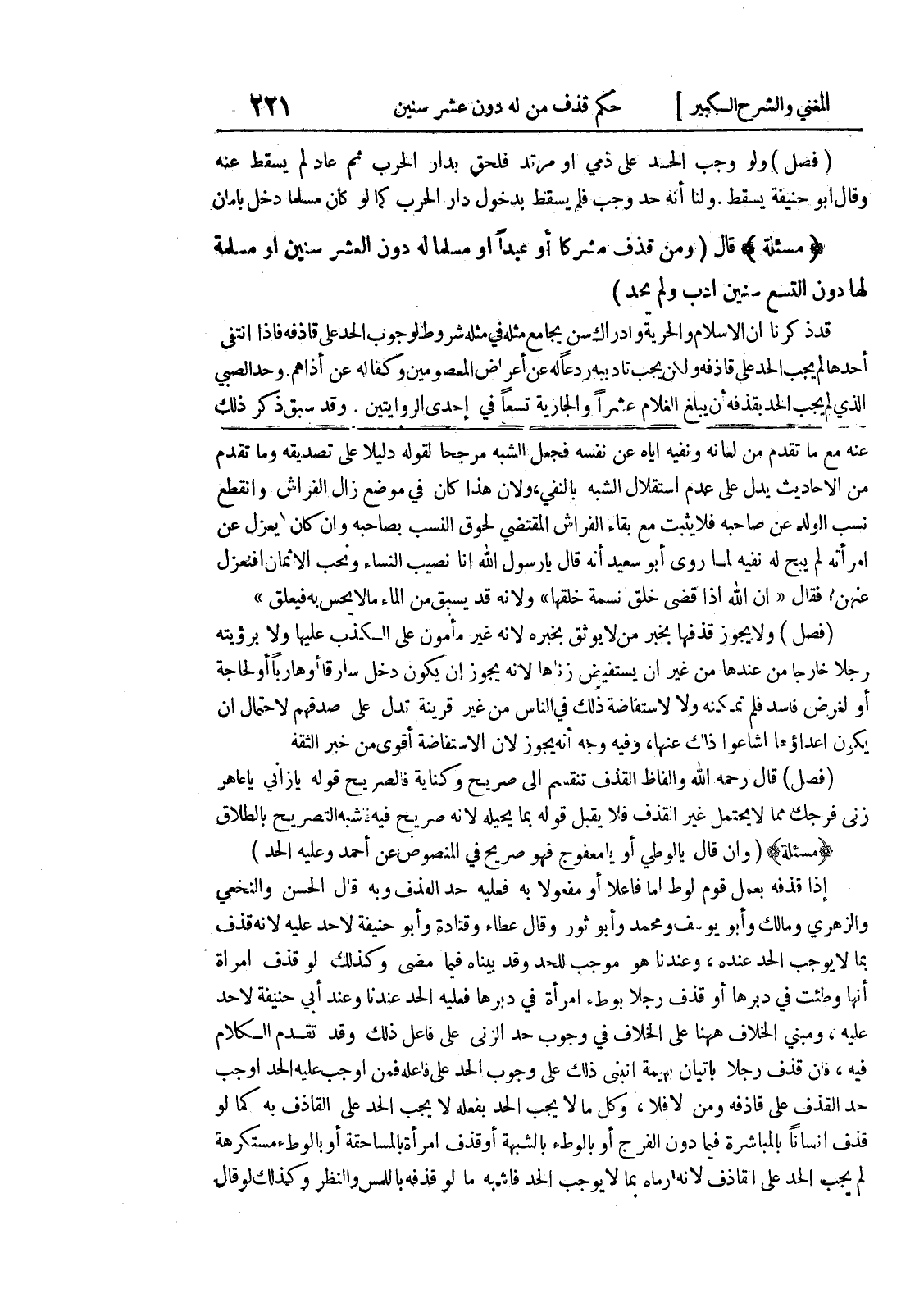 عنه مع ما تقدم من لعانه ونفيه اياه عن نفسه فجعل الشبه مرجحاً لقوله دليلاً على تصديقه وما تقدم من الأحاديث يدل على عدم استقلال الشبه بالنفي، ولأن هذا كان في موضع زال الفراش وانقطع نسب الولد عن صاحبه فلا يثبت مع بقاء الفراش المقتضي لحوق النسب بصاحبه وإن كان يعزل عن امرأته لم يبح له نفيه لما روى أبو سعيد أنه قال يا رسول الله إنا نصيب النساء ونحب الأثمان أفنعزل عنهن؟ فقال (إن الله إذا قضى خلق نسمة خلقها) ولأنه قد يسبق من الماء ما لا يحس به فيعلق) (فصل) ولا يجوز قذفها بخبر من لا يوثق بخبره لأنه غير مأمون على الكذب عليها ولا برؤيته رجلاً خارجا من عندها من غير أن يستفيض زناها لأنه يجوز أن يكون دخل سارقاً أو هارباً أو لحاجة أو لغرض فاسد فلم تمكنه ولا لاستفاضة ذلك في الناس من غير قرينة تدل على صدقهم لاحتمال أن يكون أعداؤها أشاعوا ذلك عنها، وفيه وجه أنه يجوز لأن الاستفاضة أقوى من خبر الثقة (فصل) قال رحمه الله والفاظ القذف تنقسم إلى صريح وكناية فالصريح قوله يا زاني يا عاهر زنى فرجك مما لا يحتمل غير القذف فلا يقبل قوله بما يحيله لأنه صريح فيه فأشبه التصريح بالطلاق (مسألة) (وإن قال يا لوطي أو يا معفوج فهو صريح في المنصوص عن أحمد وعليه الحد) إذا قذفه بعمل قوم لوط إما فاعلا أو مفعولا به فعليه حد القذف وبه قال الحسن والنخعي والزهري ومالك وأبو يوسف ومحمد وأبو ثور وقال عطاء وقتادة وأبو حنيفة لا حد عليه لأنه قذف بما لا يوجب الحد عنده، وعندنا هو موجب للحد وقد بيناه فيما مضى وكذلك لو قذف امرأة أنها وطئت في دبرها أو قذف رجلا بوطئ امرأة في دبرها فعليه الحد عندنا وعند أبي حنيفة لا حد عليه، ومبنى الخلاف ههنا على الخلاف في وجوب حد الزنى على فاعل ذلك وقد تقدم الكلام فيه، فان قذف رجلاً باتيان بهيمة انبنى ذلك على وجوب الحد على فاعله فمن أوجب عليه الحد أوجب حد القذف على قاذفه ومن لا فلا، وكل مالا يجب الحد بفعله لا يجب الحد على القاذف به كما لو قذف انساناً بالمباشرة فيما دون الفرج أو بالوطئ بالشبهة أو قذف امرأة بالمساحقة أو بالوطئ مستكرهة