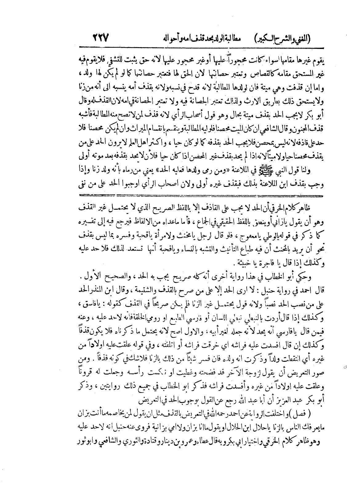 قال أحمد في رواية حنبل: لا أرى الحد إلا على من صرح بالقذف والشتيمة، وقال ابن المنذر الحد على من نصب الحد نصباً ولأنه قول يحتمل غير الزنا فلم يكن صريحاً في القذف كقوله: يا فاسق، وكذلك إذا قال أردت بالنبطي نبطي اللسان أو فارسي الطبع أو رومي الخلقة فإنه لا حد عليه، وعنه فيمن قال يا فارسي أنه يحد لأنه جعله لغير أبيه، والأول أصح لأنه يحتمل ما ذكرناه فلا يكون قذفاً وكذلك إن قال أفسدت عليه فراشه أي خرقت فراشه أو أتلفته، وفي قوله علقت عليه أولادا من غيره أي التقطت ولداً وذكرت أنه ولده فان فسر شيئاً من ذلك بالزنا فلا شك في كونه قذفاً.