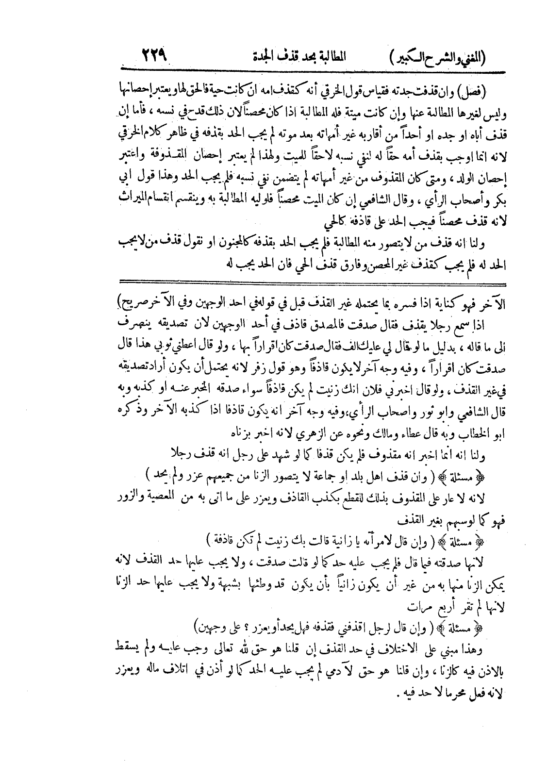 الآخر فهو كناية إذا فسره بما يحتمله غير القذف قبل في قوله في أحد الوجهين وفي الآخر صريح) إذا سمع رجلا يقذف فقال صدقت فالمصدق قاذف في أحد الوجهين لأن تصديقه ينصرف الى ما قاله، بدليل ما لو قال لي عليك الف فقال صدقت كان اقراراً بها، ولو قال أعطني ثوبي هذا قال صدقت كان إقراراً، وفيه وجه آخر لا يكون قاذفاً وهو قول زفر لأنه يحتمل أن يكون أراد تصديقه في غير القذف، ولو قال أخبرني فلان أنك زنيت لم يكن قاذفاً سواء صدقه المخبر عنه أو كذبه وبه قال الشافعي وأبو ثور وأصحاب الرأي، وفيه وجه آخر أنه يكون قاذفاً إذا كذبه الآخر وذكره أبو الخطاب وبه قال عطاء ومالك ونحوه عن الزهري لأنه أخبر بزناه ولنا أنه إنما أخبر أنه مقذوف فلم يكن قذفاً كما لو شهد على رجل أنه قذف رجلا (مسألة) (وإن قذف أهل بلد أو جماعة لا يتصور الزنا من جميعهم عزر ولم يحد) لأنه لا عار على المقذوف بذلك للقطع بكذب القاذف ويعزر على ما أتى به من المعصية والزور فهو كما لو سبهم بغير القذف (مسألة) (وإن قال لامرأته يا زانية قالت بك زنيت لم تكن قاذفة) لأنها صدقته فيما قال فلم يجب عليه حد كما لو قالت صدقت، ولا يجب عليها حد القذف لأنه يمكن الزنا منها به من غير أن يكون زانياً بأن يكون قد وطئها بشبهة ولا يجب عليها حد الزنا لأنها لم تقر أربع مرات (مسألة) (وإن قال لرجل اقذفني فقذفه فهل يحد أو يعزر؟ على وجهين) وهذا مبني على الاختلاف في حد القذف إن قلنا هو حق لله تعالى وجب عليه ولم يسقط بالإذن فيه كالزنا، وإن قلنا هو حق لآدمي لم يجب عليه الحد كما لو أذن في اتلاف ماله ويعزر لأنه فعل محرماً لا حد فيه.