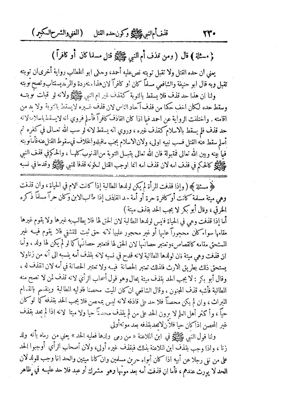 (مسألة) (وإذا قذفت المرأة لم يكن لولدها المطالبة إذا كانت الأم في الحياة، وإن قذفت وهي ميتة مسلمة كانت أو كافرة حرة أو أمة حد القاذف إذا طالب الابن وكان حراً مسلماً ذكره الخرقي وقال أبو بكر لا يجب الحد بقذف ميتة) أما إذا قذفت وهي في الحياة فليس لولدها المطالبة لأن الحق لها فلا يطالب به غيرها ولا يقوم غيرها مقامها سواء كان محجوراً عليها أو غير محجور عليها لأنه حق ثبت للتشفي فلا يقوم فيه غير المستحق مقامه كالقصاص، وتعتبر حصانتها لأن الحق لها فتعتبر حصانتها كما لو لم يكن لها ولد، وأما إن قذفت وهي ميتة فان لولدها المطالبة لأنه قدح في نسبه لأنه بقذف أمه ينسبه الى أنه من زنا ولا يستحق ذلك بطريق الارث فلذلك تعتبر الحصانة فيه ولا تعتبر الحصانة في أمه لأن القذف له، وقال أبو بكر: لا يجب الحد بقذف ميتة بحال وهو قول أصحاب الرأي لأنه قذف لمن لا تصح منه المطالبة فأشبه قذف المجنون، وقال الشافعي إن كان الميت محصنا فلوليه المطالبة وينقسم بانقسام الميراث، وإن لم يكن محصناً فلا حد على قاذفه لأنه ليس بمحصن فلا يجب الحد بقذفه كما لو كان حياً، وأكثر أهل العلم لا يرون الحد على من لم يقذف محصناً حياً ولا ميتاً لأنه إذا لم يحد بقذف غير المحصن إذا كان حياً فلأن لا يحد بقذفه بعد موته أولى ولنا قول النبي صلى الله عليه وسلم في ابن الملاعنة (من رمى ولدها فعليه الحد) يعني من رماه بأنه ولد زنا، واذا وجب بقذف ابن الملاعنة بذلك فبقذف غيره أولى، ولأن أصحاب الرأي أوجبوا الحد على من نفى رجلا عن أبيه إذا كان أبواه حرين مسلمين وإن كانا ميتين والحد إنما وجب للولد لأن الحد لا يورث عندهم، فأما إن قذفت أمه بعد موتها وهو مشرك أو عبد فلا حد عليه في ظاهر