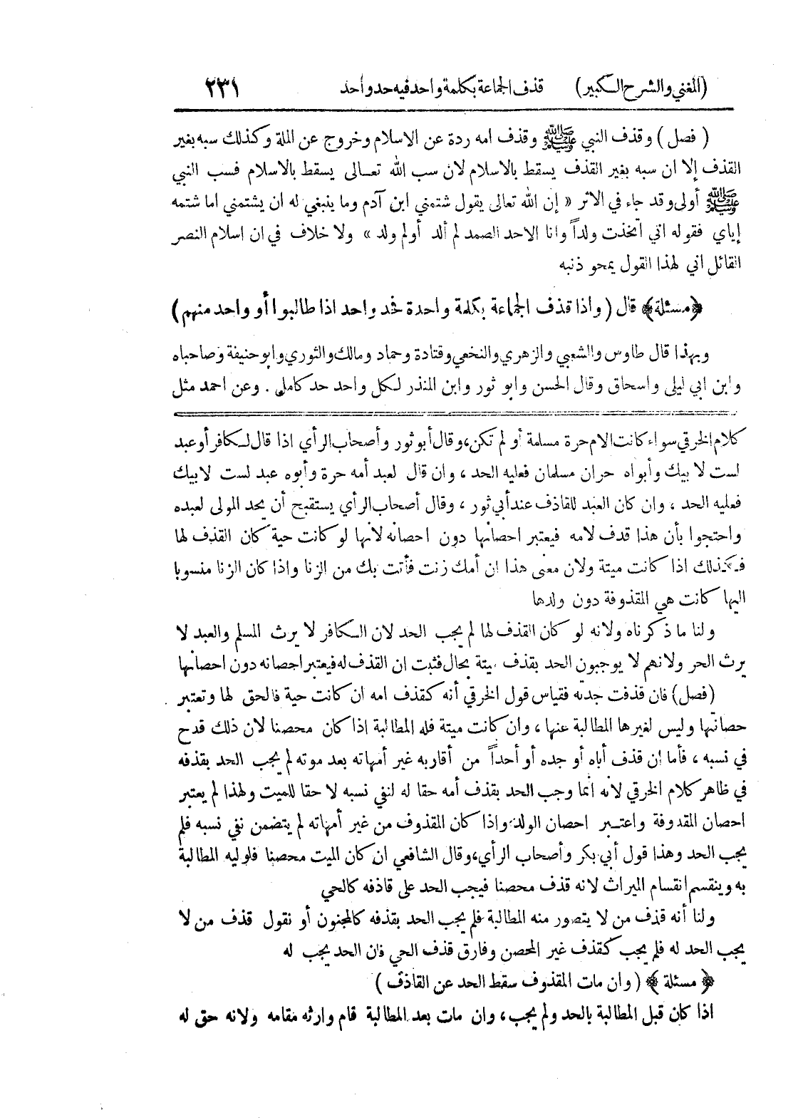 واحتجوا بأن هذا قذف لأمه فيعتبر احصانها دون إحصانه لأنها لو كانت حية كان القذف لها فكذلك إذا كانت ميتة ولأن معنى هذا أن أمك زنت فأتت بك من الزنا وإذا كان الزنا منسوباً إليها كانت هي المقذوفة دون ولدها ولنا ما ذكرناه ولأنه لو كان القذف لها لم يجب الحد لأن الكافر لا يرث المسلم والعبد لا يرث الحر ولأنهم لا يوجبون الحد بقذف ميتة بحال فثبت أن القذف له فيعتبر إحصانه دون إحصانها (فصل) فان قذفت جدته فقياس قول الخرقي أنه كقذف أمه إن كانت حية فالحق لها وتعتبر حصانتها وليس لغيرها المطالبة عنها، وإن كانت ميتة فله المطالبة إذا كان محصناً لأن ذلك قدح في نسبه، فأما إن قذف أباه أو جده أو أحداً من أقاربه غير أمهاته بعد موته لم يجب الحد بقذفه في ظاهر كلام الخرقي لأنه إنما وجب الحد بقذف أمه حقا له لنفي نسبه لا حقا للميت ولهذا لم يعتبر إحصان المقذوفة واعتبر إحصان الولد وإذا كان المقذوف من غير أمهاته لم يتضمن نفي نسبه فلم يجب الحد وهذا قول أبي بكر وأصحاب الرأي، وقال الشافعي إن كان الميت محصنا فلوليه المطالبة به وينقسم انقسام الميراث لأنه قذف محصنا فيجب الحد على قاذفه كالحي ولنا أنه قذف من لا يتصور منه المطالبة فلم يجب الحد بقذفه كالمجنون أو نقول قذف من لا يجب الحد له فلم يجب كقذف غير المحصن وفارق قذف الحي فان الحد يجب له (مسألة) (وإن مات المقذوف سقط الحد عن القاذف) إذا كان قبل المطالبة بالحد ولم يجب، وإن مات بعد المطالبة قام وارثه مقامه ولأنه حق له