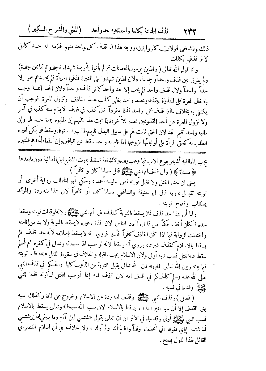 يجب بالمطالبة أشبه رجوع الأب فيما وهب ولده وكالشفعة تسقط بموت الشفيع قبل المطالبة دون ما بعدها (مسألة) (وإن قذف أم النبي صلى الله عليه وسلم قتل مسلما كان أو كافراً) يعني أن حده القتل ولا تقبل توبته نص عليه أحمد، وحكى أبو الخطاب رواية أخرى أن توبته تقبل، وبه قال أبو حنيفة والشافعي مسلما كان أو كافراً لأن هذا منه ردة والمرتد يستتاب وتصح توبته.