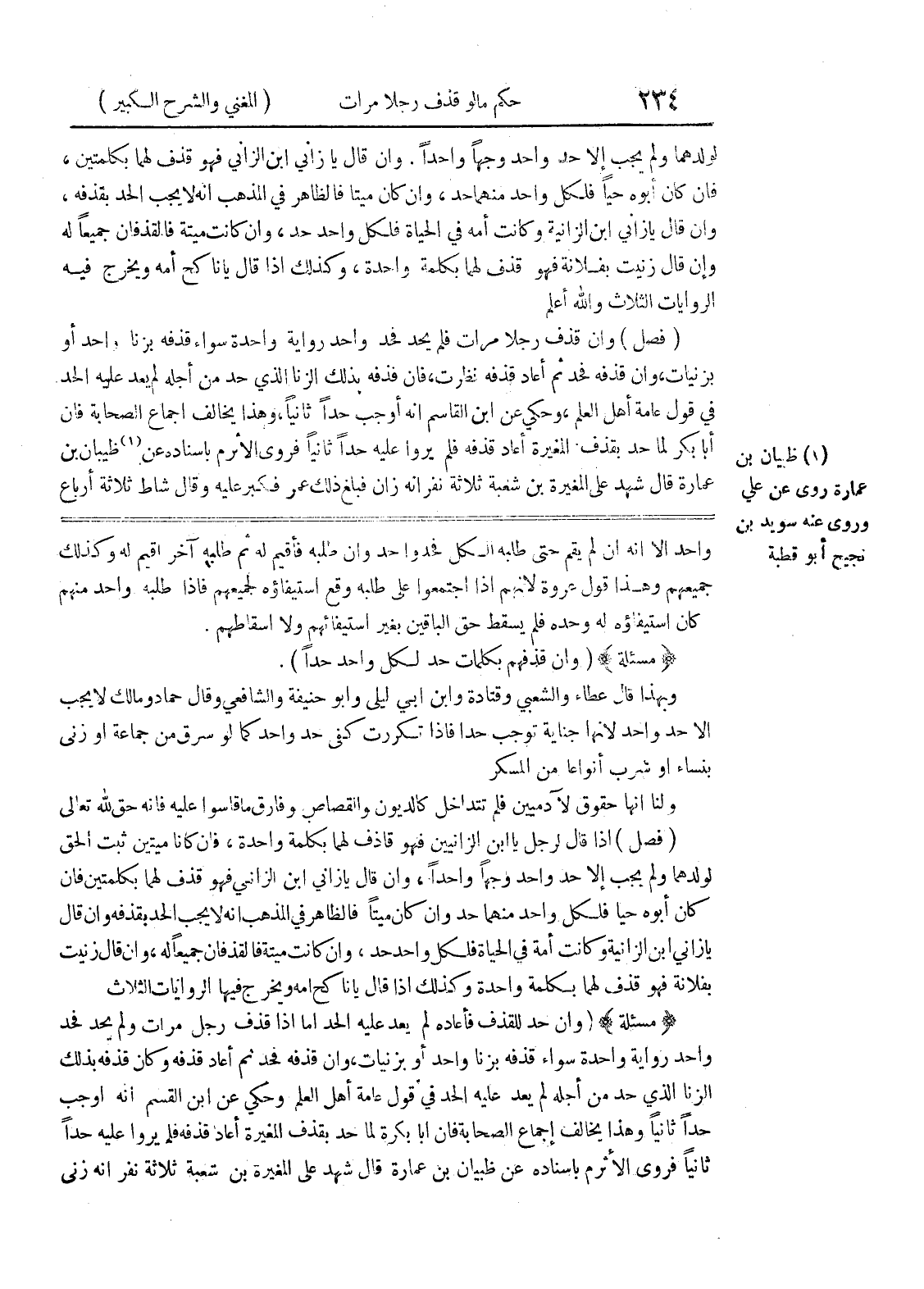 بفلانة فهو قذف لهما بكلمة واحدة وكذلك إذا قال يا ناكح امه ويخرج فيها الروايات الثلاث (مسألة) (وإن حد للقذف فأعاده لم يعد عليه الحد أما اذا قذف رجل مرات ولم يحد فحد واحد رواية واحدة سواء قذفه بزنا واحد أو بزنيات، وإن قذفه فحد ثم أعاد قذفه وكان قذفه بذلك الزنا الذي حد من أجله لم يعد عليه الحد في قول عامة أهل العلم وحكي عن ابن القسم أنه أوجب حداً ثانياً وهذا يخالف إجماع الصحابة فإن أبا بكرة لما حد بقذف المغيرة أعاد قذفه فلم يروا عليه حداً ثانياً فروى الأثرم بإسناده عن ظبيان بن عمارة قال شهد على المغيرة بن شعبة ثلاثة نفر أنه زنى