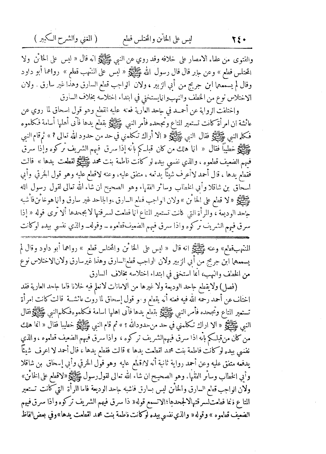 المنتهب قطع) وعنه صلى الله عليه وسلم أنه قال (ليس على الخائن والمختلس قطع) رواهما أبو داود وقال لم يسمعهما ابن جريج من أبي الزبير ولأن الواجب قطع السارق وهذا غير سارق ولأن الاختلاس نوع من الخطف والنهب، إنما استخفى في ابتداء اختلاسه بخلاف السارق (فصل) ولا يقطع جاحد الوديعة ولا غيرها من الأمانات لا نعلم فيه خلافاً فأما جاحد العارية فقد اختلف عن أحمد رحمه الله فيه فعنه أنه يقطع وهو قول إسحاق لما روت عائشة قالت كانت امرأة تستعير المتاع وتجحده فأمر النبي صلى الله عليه وسلم بقطع يدها فأتى أهلها أسامة فكلموه فكلم النبي صلى الله عليه وسلم فقال النبي صلى الله عليه وسلم (ألا أراك تكلمني في حد من حدود الله؟) ثم قام النبي صلى الله عليه وسلم خطيباً فقال (إنما هلك من كان من قبلكم بأنه إذا سرق فيهم الشريف تركوه، وإذا سرق فيهم الضعيف قطعوه، والذي نفسي بيده لو كانت فاطمة بنت محمد لقطعت يدها) قالت فقطع يدها، قال أحمد لا اعرف شيئا يدفعه متفق عليه وعن أحمد رواية ثانية أنه لا قطع عليه وهو قول الخرقي وأبي إسحاق بن شاقلا وأبي الخطاب وسائر الفقهاء وهو الصحيح إن شاء الله تعالى لقول رسول صلى الله عليه وسلم (لا قطع على الخائن) ولأن الواجب قطع السارق والخائن ليس بسارق فأشبه جاحد الوديعة فأما المرأة التي كانت تستعير المتاع فانما قطعت لسرقتها لا لجحدها: ألا تسمع قوله (ذا سرق فيهم الشريف تركوه وإذا سرق فيهم الضعيف قطعوه) وقوله (والذي نفسي بيده لو كانت فاطمة بنت محمد لقطعت يدها) وفي بعض ألفاظ