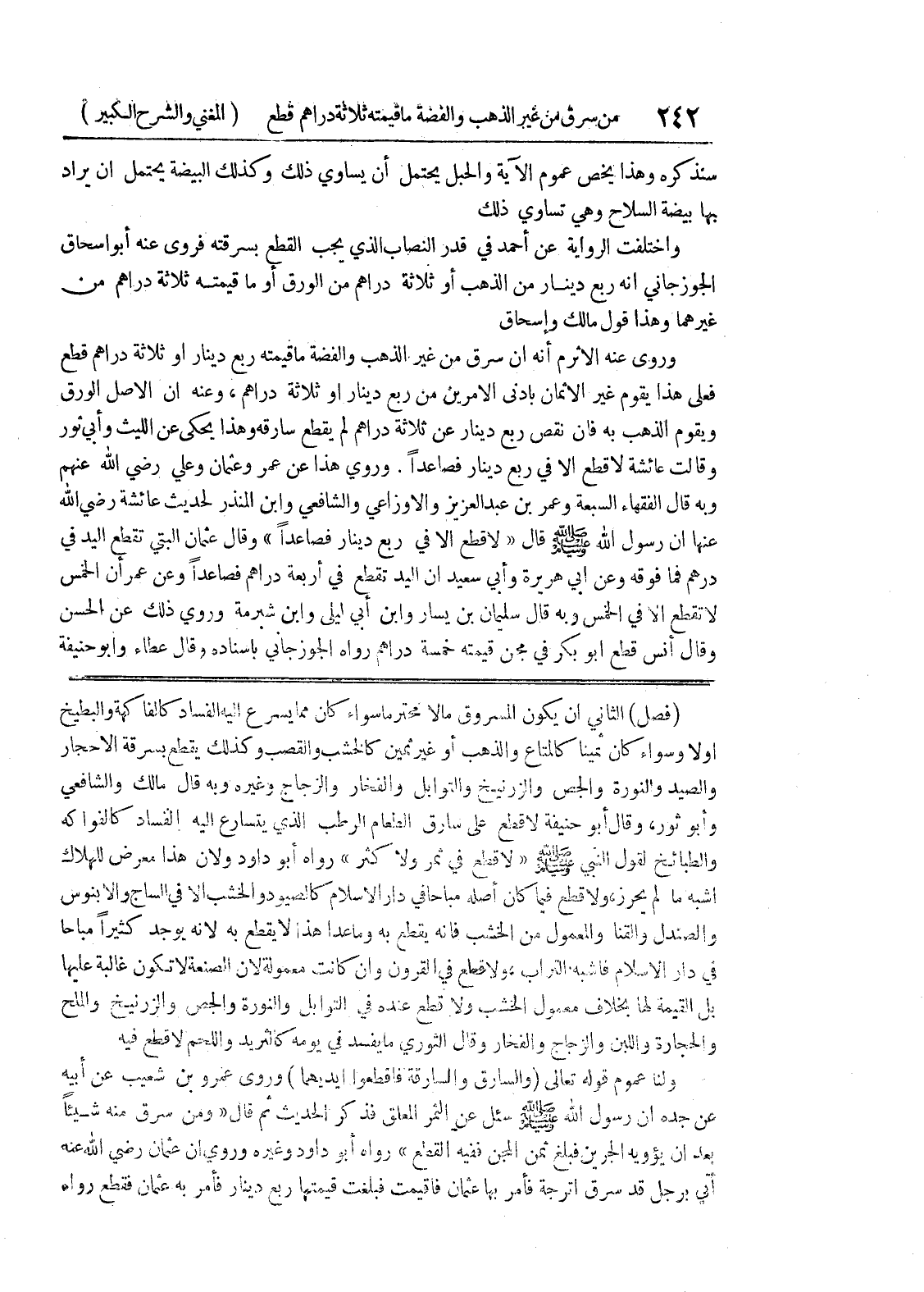 (فصل) الثاني أن يكون المسروق مالاً محترماً سواء كان مما يسرع اليه الفساد كالفاكهة والبطيخ اولا وسواء كان ثميناً كالمتاع والذهب أو غير ثمين كالخشب والقصب وكذلك يقطع بسرقة الأحجار والصيد والنورة والجص والزرنيخ والتوابل والفخار والزجاج وغيره وبه قال مالك والشافعي وأبو ثور، وقال أبو حنيفة لا قطع على سارق الطعام الرطب الذي يتسارع إليه الفساد كالفواكه والطبائخ لقول النبي صلى الله عليه وسلم (لا قطع في ثمر ولا كثر) رواه أبو داود ولأن هذا معرض للهلاك أشبه ما لم يحرز، ولا قطع فيما كان أصله مباحاً في دار الإسلام كالصيود والخشب إلا في الساج والابنوس والصندل والقنا والمعمول من الخشب فانه يقطع به وما عدا هذا لا يقطع به لأنه يوجد كثيراً مباحاً في دار الإسلام فأشبه التراب، ولا قطع في القرون وإن كانت معمولة لأن الصنعة لا تكون غالبة عليها بل القيمة لها بخلاف معمول الخشب ولا قطع عنده في التوابل والنورة والجص والزرنيخ والملح والحجارة واللبن والزجاج والفخار وقال الثوري ما يفسد في يومه كالثريد واللحم لا قطع فيه ولنا عموم قوله تعالى (والسارق والسارقة فاقطعوا أيديهما) وروى عمرو بن شعيب عن أبيه عن جده أن رسول الله صلى الله عليه وسلم سئل عن الثمر المعلق فذكر الحديث ثم قال (ومن سرق منه شيئاً بعد ان يؤويه الجرين فبلغ ثمن المجن ففيه القطع) رواه أبو داود وغيره وروي أن عثمان رضي الله عنه أتي برجل قد سرق اترجة فأمر بها عثمان فأقيمت فبلغت قيمتها ربع دينار فأمر به عثمان فقطع رواه