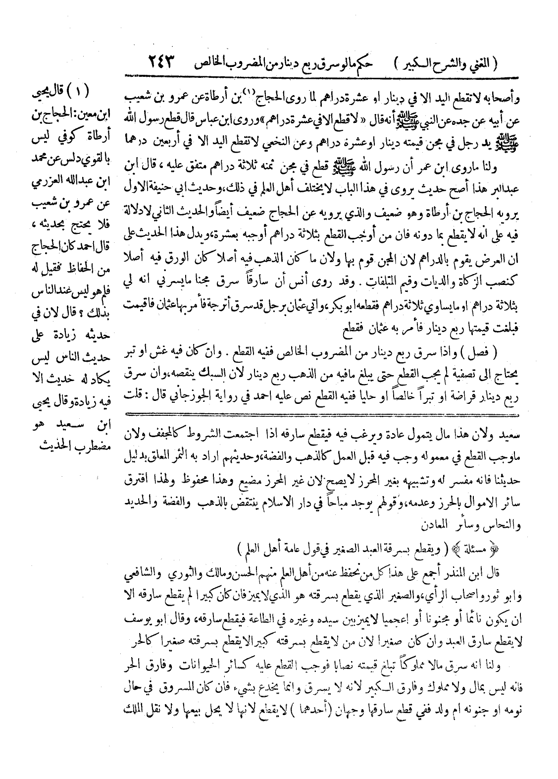 سعيد ولأن هذا مال يتمول عادة ويرغب فيه فيقطع سارقه إذا اجتمعت الشروط كالمجفف ولأن ما وجب القطع في معموله وجب فيه قبل العمل كالذهب والفضة، وحديثهم أراد به الثمر المعلق بدليل حديثنا فانه مفسر له وتشبيهه بغير المحرز لا يصح لأن غير المحرز مضيع وهذا محفوظ ولهذا افترق سائر الاموال بالحرز وعدمه، وقولهم يوجد مباحاً في دار الإسلام ينتقض بالذهب والفضة والحديد والنحاس وسائر المعادن (مسألة) (ويقطع بسرقة العبد الصغير في قول عامة أهل العلم) قال ابن المنذر أجمع على هذا كل من نحفظ عنه من أهل العلم منهم الحسن ومالك والثوري والشافعي وأبو ثور وأصحاب الرأي، والصغير الذي يقطع بسرقته هو الذي لا يميز فان كان كبيراً لم يقطع سارقه إلا أن يكون نائماً أو مجنوناً أو أعجمياً لا يميز بين سيده وغيره في الطاعة فيقطع سارقه، وقال أبو يوسف لا يقطع سارق العبد وان كان صغيراً لأن من لا يقطع بسرقته كبيراً لا يقطع بسرقته صغيراً كالحر ولنا أنه سرق مالا مملوكا تبلغ قيمته نصابا فوجب القطع عليه كسائر الحيوانات وفارق الحر فإنه ليس بمال ولا مملوك وفارق الكبير لأنه لا يسرق وإنما يخدع بشئ فإن كان المسروق في حال نومه أو جنونه أم ولد ففي قطع سارقها وجهان (أحدهما) لا يقطع لأنها لا يحل بيعها ولا نقل الملك