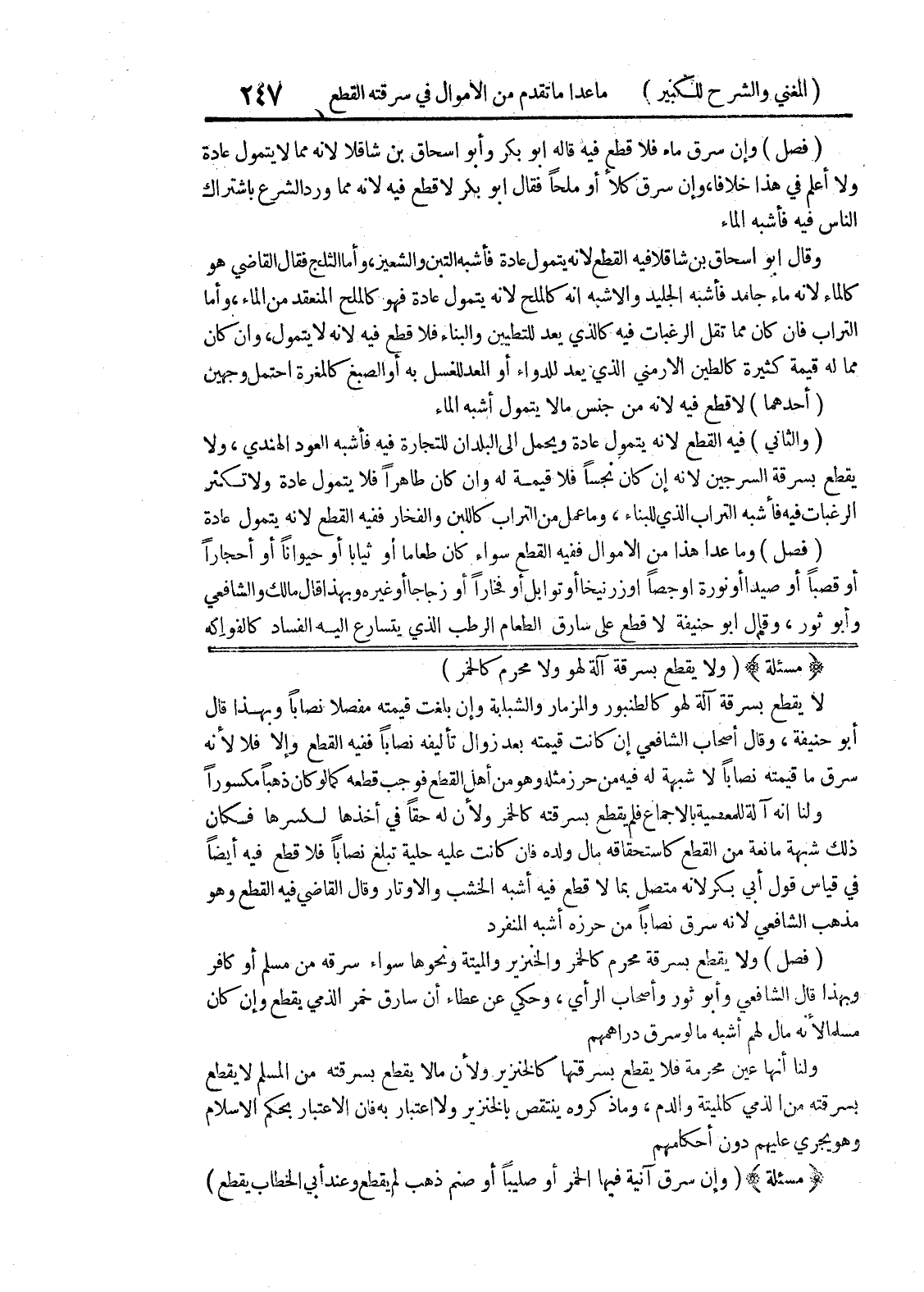 (مسألة) (ولا يقطع بسرقة آلة لهو ولا محرم كالخمر) لا يقطع بسرقة آلة لهو كالطنبور والمزمار والشبابة وإن بلغت قيمته مفصلا نصاباً وبهذا قال أبو حنيفة، وقال أصحاب الشافعي إن كانت قيمته بعد زوال تأليفه نصاباً ففيه القطع وإلا فلا لأنه سرق ما قيمته نصاباً لاشبهة له فيه من حرز مثله وهو من أهل القطع فوجب قطعه كما لو كان ذهباً مكسوراً