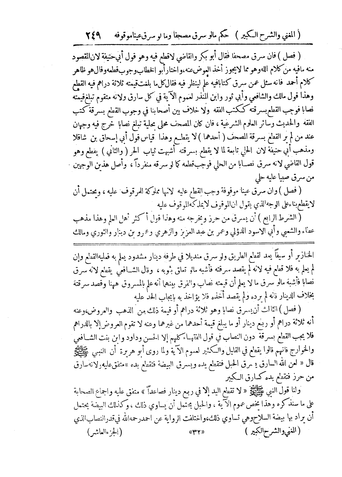 الخنازير أو سيفاً يعد لقطع الطريق ولو سرق منديلا في طرفه دينار مشدود يعلم به فعليه القطع وإن لم يعلم به فلا قطع فيه لأنه لم يقصد سرقته فأشبه مالو تعلق بثوبه، وقال الشافعي يقطع لأنه سرق نصابا فأشبه مالو سرق ما لا يعلم أن قيمته نصاب والفرق بينهما أنه علم بالمسروق ههنا وقصد سرقته بخلاف الدينار فانه لم يرده ولم يقصد أخذه فلا يؤاخذ به بايجاب الحد عليه (فصل) الثالث أن يسرق نصابا وهو ثلاثة دراهم أو قيمة ذلك من الذهب والعروض، وعنه أنه ثلاثة دراهم أو ربع دينار أو ما يبلغ قيمة أحدهما من غيرهما وعنه لا تقوم العروض إلا بالدراهم فلا يجب القطع بسرقة دون النصاب في قول الفقهاء كلهم إلا الحسن وداود وابن بنت الشافعي والخوارج فإنهم قالوا يقطع في القليل والكثير لعموم الآية ولما روى أبو هريرة أن النبي صلى الله عليه وسلم قال (لعن الله السارق يسرق الحبل فتقطع يده ويسرق البيضة فتقطع يده) متفق عليه ولأنه سارق من حرز فتقطع يده كسارق الكبير ولنا قول النبي صلى الله عليه وسلم (لا تقطع اليد إلا في ربع دينار فصاعداً) متفق عليه واجماع الصحابة على ما سنذكره وهذا يخص عموم الآية، والحبل يحتمل أن يساوي ذلك، وكذلك البيضة يحتمل أن يراد بها البيضة السلاح وهي تساوي ذلك، واختلفت الرواية عن أحمد رحمه الله في قدر النصاب الذي
