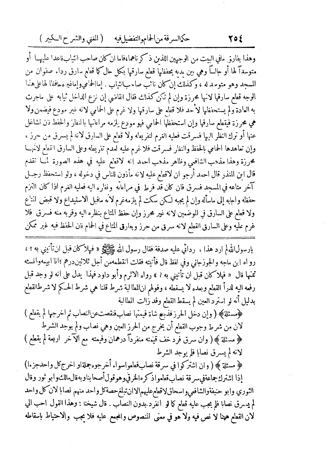يارسول الله لم أرد هذا، ردائي عليه صدقة فقال رسول الله صلى الله عليه وسلم (فهلا كان قبل أن تأتيني به؟) رواه ابن ماجه والجوزجاني وفي لفظ قال فأتيته فقلت اتقطعه من أجل ثلاثين درهم؟ أنا أبيعه وانسئه ثمنها قال (فهلا كان قبل أن تأتيني به؟) رواه الاثرم وأبو داود فهذا يدل على أنه لو وجد قبل رفعه اليه لدرأ القطع وبعده لا يسقطه، وقولهم ان المطالبة شرط قلنا هي شرط الحكم لا شرط القطع بدليل أنه لو استرد العين لم يسقط القطع وقد زالت المطالبة (مسألة) (وإن دخل الحرز فذبح شاة قيمتها نصاب فنقصت عن النصاب ثم أخرجها لم يقطع) لأن من شرط وجوب القطع أن يخرج من الحرز العين وهي نصاب ولم يوجد الشرط (مسألة) (وإن سرق فرد خف قيمته منفرداً درهمان وقيمته مع الآخر أربعة لم يقطع) لأنه لم يسرق نصابا فلم يوجد الشرط (مسألة) (وإن اشتركوا في سرقة نصاب قطعوا سواء أخرجوه جملة أو أخرج كل واحد جزءاً)