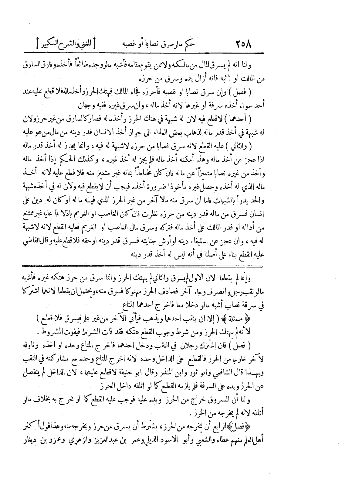 (فصل) فان اشترك رجلان في النقب ودخل أحدهما فاخرج المتاع وحده أو أخذه وناوله لآخر خارجا من الحرز فالقطع على الداخل وحده لأنه أخرج المتاع وحده مع مشاركته في النقب وبهذا قال الشافعي وابو ثور وابن المنذر وقال أبو حنيفة لاقطع عليهما، لأن الداخل لم ينفصل عن الحزر ويده على السرقة فلم يلزمه القطع كما لو أتلفه داخل الحرز ولنا أن المسروق خرج من الحرز ويده عليه فوجب عليه القطع كما لو خرج به بخلاف مالو أتلفه لأنه لم يخرجه من الحرز.