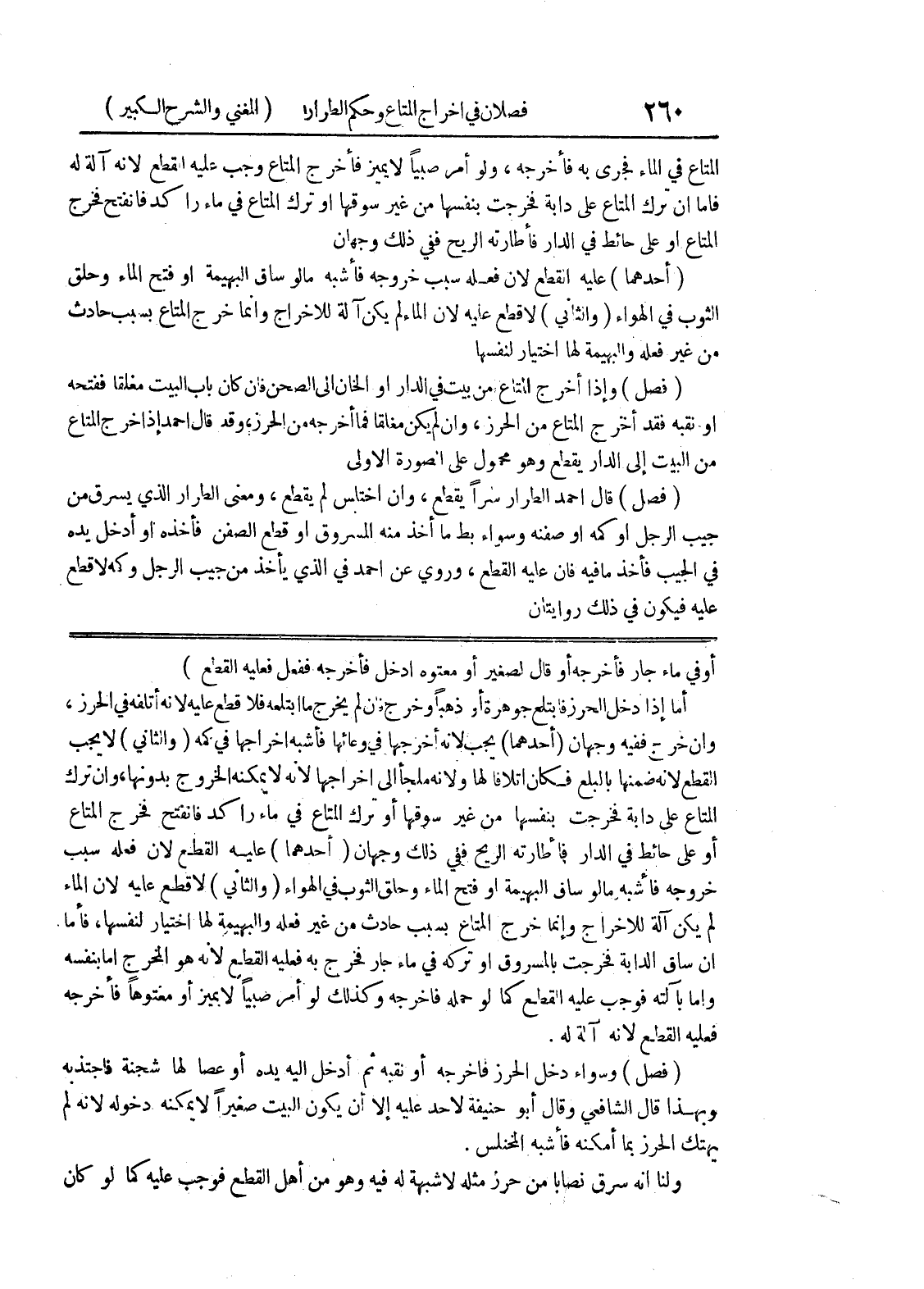 أو في ماء جار فأخرجه أو قال لصغير أو معتوه ادخل فأخرجه ففعل فعليه القطع) أما إذا دخل الحرز فابتلع جوهرة أو ذهباً وخرج فان لم يخرج ما ابتلعه فلا قطع عليه لأنه أتلفه في الحرز، وإن خرج ففيه وجهان (أحدهما) يجب لأنه أخرجها في وعائها فأشبه إخراجها في كمه (والثاني) لا يجب القطع لأنه ضمنها بالبلع فكان اتلافاً لها ولأنه ملجأ الى اخراجها لأنه لا يمكنه الخروج بدونها، وإن ترك المتاع على دابة فخرجت بنفسها من غير سوقها أو ترك المتاع في ماء راكد فانفتح فخرج المتاع أو على حائط في الدار فأطارته الريح ففي ذلك وجهان (أحدهما) عليه القطع لأن فعله سبب خروجه فأشبه مالو ساق البهيمة أو فتح الماء وحلق الثوب في الهواء (والثاني) لا قطع عليه لأن الماء لم يكن آلة للاخراج وإنما خرج المتاع بسبب حادث من غير فعله والبهيمة لها اختيار لنفسها، فأما إن ساق الدابة فخرجت بالمسروق أو تركه في ماء جار فخرج به فعليه القطع لأنه هو المخرج إما بنفسه وإما بآلته فوجب عليه القطع كما لو حمله فأخرجه وكذلك لو أمر صبياً لا يميز أو معتوهاً فأخرجه فعليه القطع لأنه آلة له.