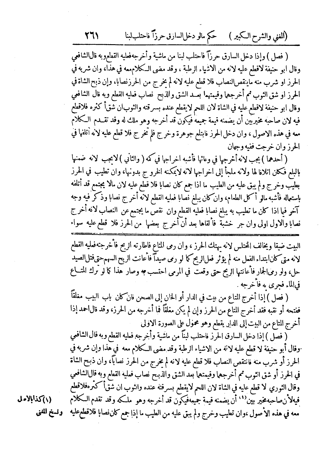 (فصل) إذا أخرج المتاع من بيت في الدار أو الخان إلى الصحن فان كان باب البيت مغلقاً ففتحه أو نقبه فقد أخرج المتاع من الحرز وإن لم يكن مغلقاً فما أخرجه من الحرز، وقد قال أحمد إذا أخرج المتاع من البيت إلى الدار يقطع وهو محمول على الصورة الاولى (فصل) إذا دخل السارق الحرز فاحتلب لبناً من ماشية وأخرجه فعليه القطع وبه قال الشافعي وقال أبو حنيفة لا قطع عليه لأنه من الأشياء الرطبة وقد مضى الكلام معه في هذا وإن شربه في الحرز أو شرب منه فانتقص النصاب فلا قطع عليه لأنه لم يخرج من الحرز نصاباً، وإن ذبح الشاة في الحرز أو شق الثوب ثم أخرجهما وقيمتهما بعد الشق والذبح نصاب فعليه القطع وبه قال الشافعي وقال الثوري لا قطع عليه في الشاة لأن اللحم لا يقطع بسرقته عنده والثوب إن شق أكثره فلا قطع فيه لأن صاحبه مخير بين (1) أن يضمنه قيمة جميعه فيكون قد أخرجه وهو ملكه وقد تقدم الكلام معه في هذه الأصول، وان تطيب وخرج ولم يبق عليه من الطيب ما إذا جمع كان نصاباً فلا قطع عليه
