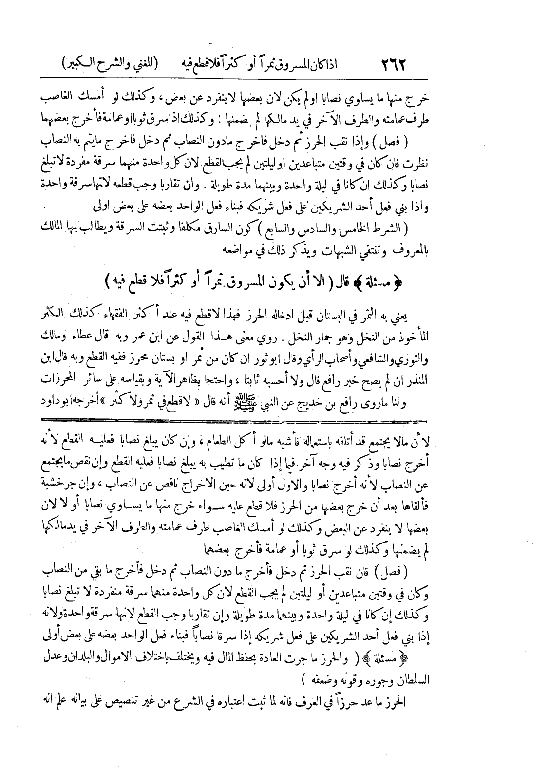 أخرج نصاباً وذكر فيه وجه آخر فيما إذا كان ما تطيب به يبلغ نصبا فعليه القطع وإن نقص ما يجتمع عن النصاب لأنه أخرج نصابا والأول أولى لأنه حين الإخراج ناقص عن النصاب، وإن جر خشبة فألقاها بعد أن خرج بعضها من الحرز فلا قطع عليه سواء خرج منها ما يساوي نصاباً أو لا لأن بعضها لا ينفرد عن البعض وكذلك لو أمسك الغاصب طرف عمامته والطرف الآخر في يد مالكها لم يضمنها وكذلك لو سرق ثوباً أو عمامة فأخرج بعضهما (فصل) فان نقب الحرز ثم دخل فأخرج ما دون النصاب ثم دخل فأخرج ما بقي من النصاب وكان في وقتين متباعدين أو ليلتين لم يجب القطع لأن كل واحدة منهما سرقة منفردة لا تبلغ نصابا وكذلك إن كانا في ليلة واحدة وبينهما مدة طويلة وإن تقاربا وجب القطع لأنها سرقة واحدة ولأنه إذا بني فعل أحد الشريكين على فعل شريكه إذا سرقا نصاباً فبناء فعل الواحد بعضه على بعض أولى (مسألة) (والحرز ما جرت العادة بحفظ المال فيه ويختلف باختلاف الاموال والبلدان وعدل السلطان وجوره وقوته وضعفه) الحرز ما عدا حرزاً في العرف فانه لم ثبت اعتباره في الشرع من غير تنصيص على بيانه علم أنه