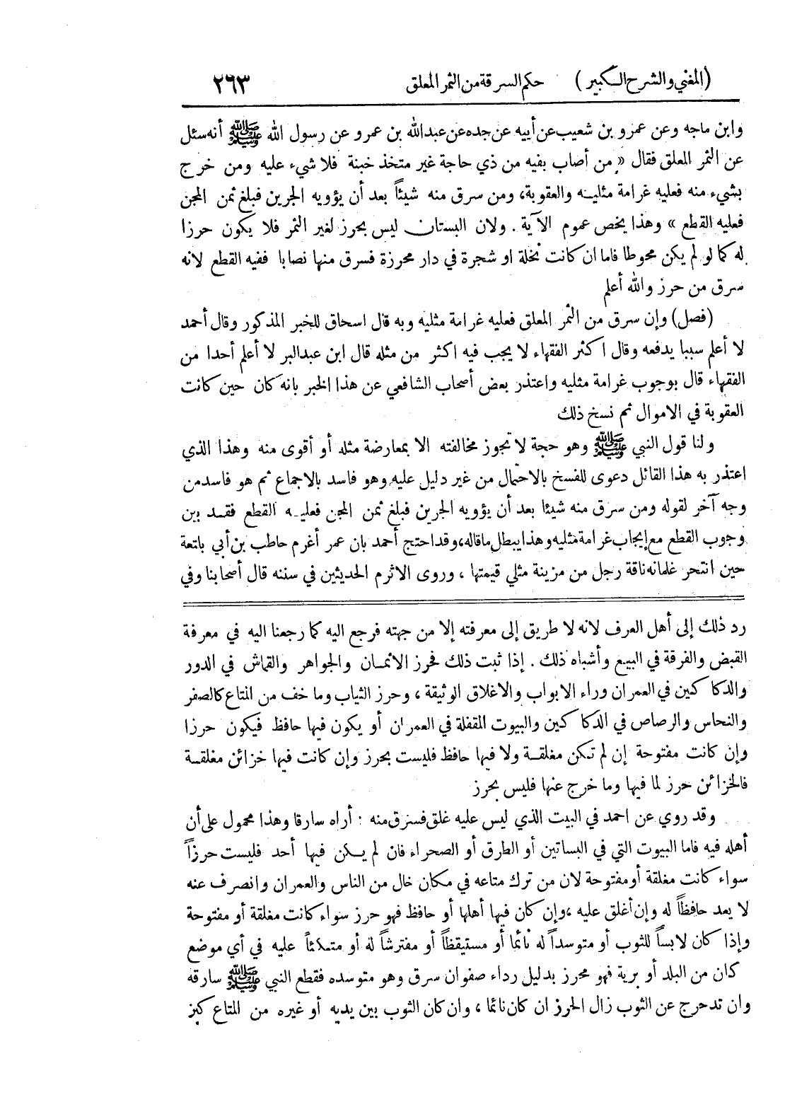 إذا ثبت ذلك فحرز الاثمان والجواهر والقماش في الدور والدكاكين في العمران وراء الأبواب والأغلاق الوثيقة، وحرز الثياب وما خف من المتاع كالصفر والنحاس والرصاص في الدكاكين والبيوت المقفلة في العمران أو يكون فيها حافظ فيكون حرزاً وإن كانت مفتوحة إن لم تكن مغلقة ولا فيها حافظ فليست بحرز وإن كانت فيها خزائن مغلقة فالخزائن حرز لما فيها وما خرج عنها فليس بحرز وقد روي عن أحمد في البيت الذي ليس عليه غلق فسرق منه: أراه سارقاً وهذا محمول على أن أهله فيه فأما البيوت التي في البساتين أو الطرق أو الصحراء فإن لم يكن فيها أحد فليست حرزاً سواء كانت مغلقة أو مفتوحة لأن من ترك متاعه في مكان خال من الناس والعمران وانصرف عنه