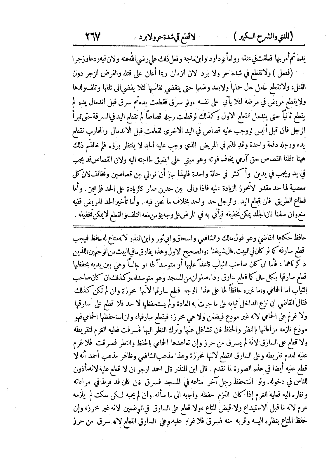 قال شيخنا: والصحيح الأول وهذا يفارق ما في البيت من الوجهين اللذين ذكرناهما، فأما إن كان صاحب الثياب قاعداً عليها أو متوسداً لها أو جالساً وهي بين يديه يحفظها قطع سارقها بكل حال كما قطع سارق رداء صفوان من المسجد وهو متوسد له، وكذلك إن كان صاحب الثياب إما الحمامي وإما غيره حافظاً لها على هذا الوجه قطع سارقها لأنها محرزة وإن لم تكن كذلك فقال القاضي إن نزع الداخل ثيابه على ما جرت به العادة ولم يستحفظها لأحد فلا قطع على سارقها ولا غرم على الحمامي لأنه غير مودع فيضمن ولا هي محرزة فيقطع سارقها، وإن استحفظها الحمامي فهو مودع تلزمه مراعاتها بالنظر والحفظ فان تشاغل عنها وترك النظر إليها فسرقت فعليه الغرم لتفريطه ولا قطع على السارق لأنه لم يسرق من حرز وإن تعاهدها الحمامي بالحفظ والنظر فسرقت فلا غرم عليه لعدم تفريطه وعلى السارق القطع لأنها محرزة وهذا مذهب الشافعي وظاهر مذهب أحمد أنه لا قطع عليه أيضاً في هذه الصورة لما تقدم.