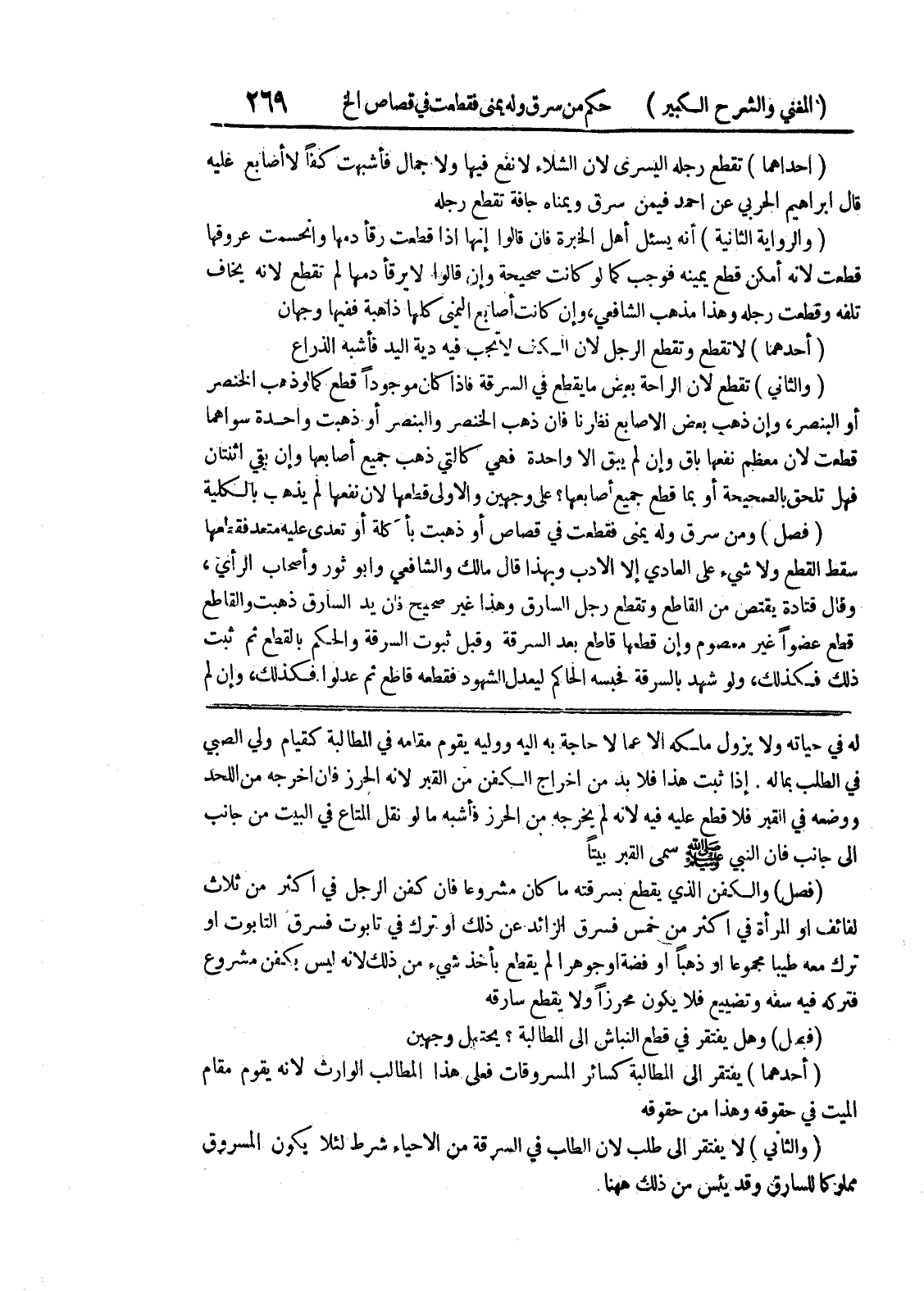إذا ثبت هذا فلابد من إخراج الكفن من القبر لأنه الحرز فان أخرجه من اللحد ووضعه في القبر فلا قطع عليه فيه لأنه لم يخرجه من الحرز فأشبه مالو نقل المتاع في البيت من جانب إلى جانب فإن النبي صلى الله عليه وسلم سمى القبر بيتاً (فصل) والكفن الذي يقطع بسرقته ما كان مشروعاً فان كفن الرجل في أكثر من ثلاث لفائف أو المرأة في أكثر من خمس فسرق الزائد عن ذلك أو ترك في تابوت فسرق التابوت أو ترك معه طيبا مجموعاً أو ذهباً أو فضة أو جوهراً لم يقطع بأخذ شئ من ذلك لأنه ليس بكفن مشروع فتركه فيه سفه وتضييع فلا يكون محرزاً ولا يقطع سارقه (فصل) وهل يفتقر في قطع النباش إلى المطالبة؟ يحتمل وجهين (احدهما) يفتقر الى المطالبة كسائر المسروقات فعلى هذا المطالب الوارث لأنه يقوم مقام