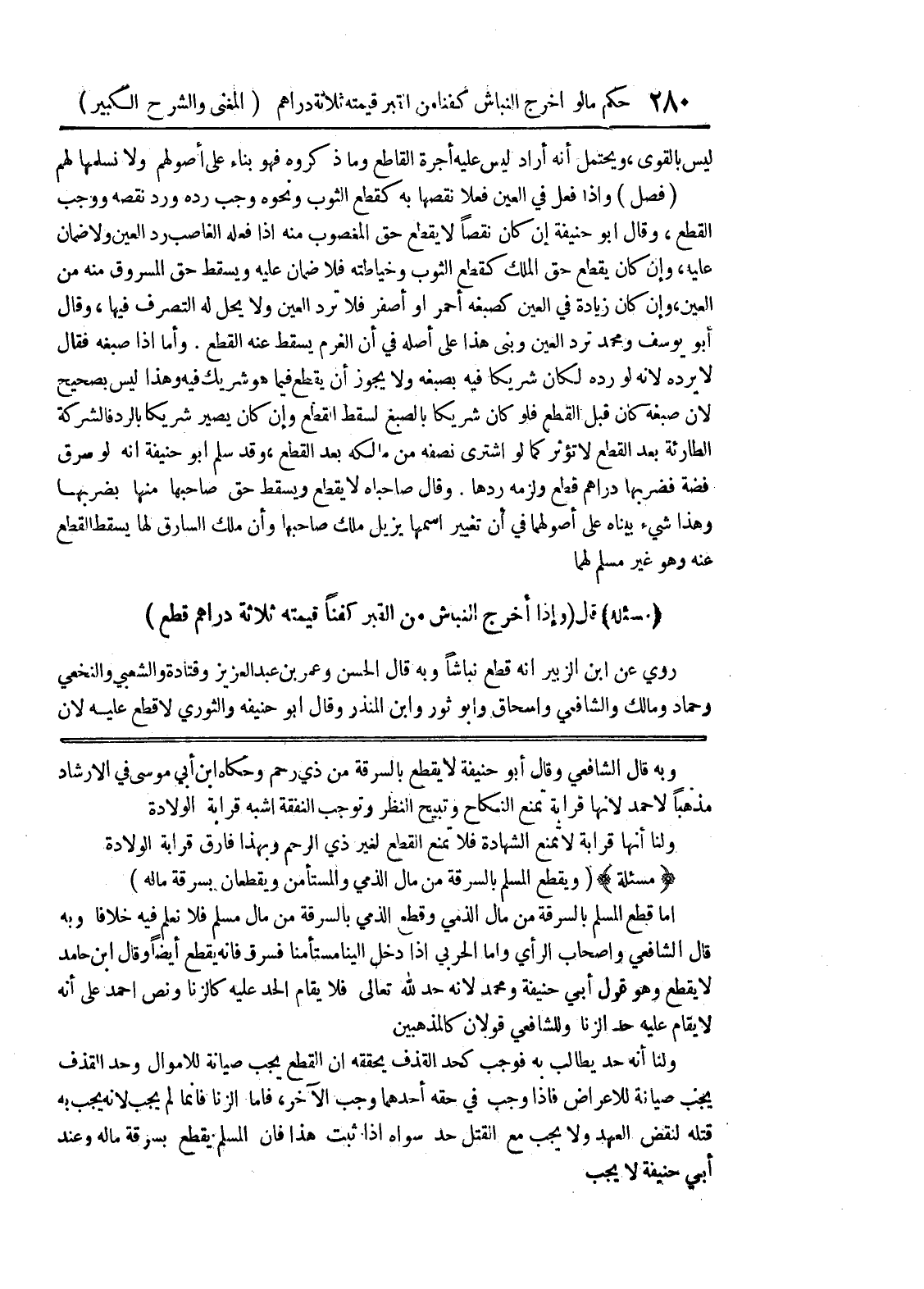 وبه قال الشافعي وقال أبو حنيفة لا يقطع بالسرقة من ذي رحم وحكاه ابن أبي موسى في الارشاد مذهباً لأحمد لأنها قرابة تمنع النكاح وتبيح النظر وتوجب النفقة أشبه قرابة الولادة ولنا أنها قرابة لا تمنع الشهادة فلا تمنع القطع لغير ذي الرحم وبهذا فارق قرابة الولادة (مسألة) (ويقطع المسلم بالسرقة من مال الذمي والمستأمن ويقطعان بسرقة ماله)