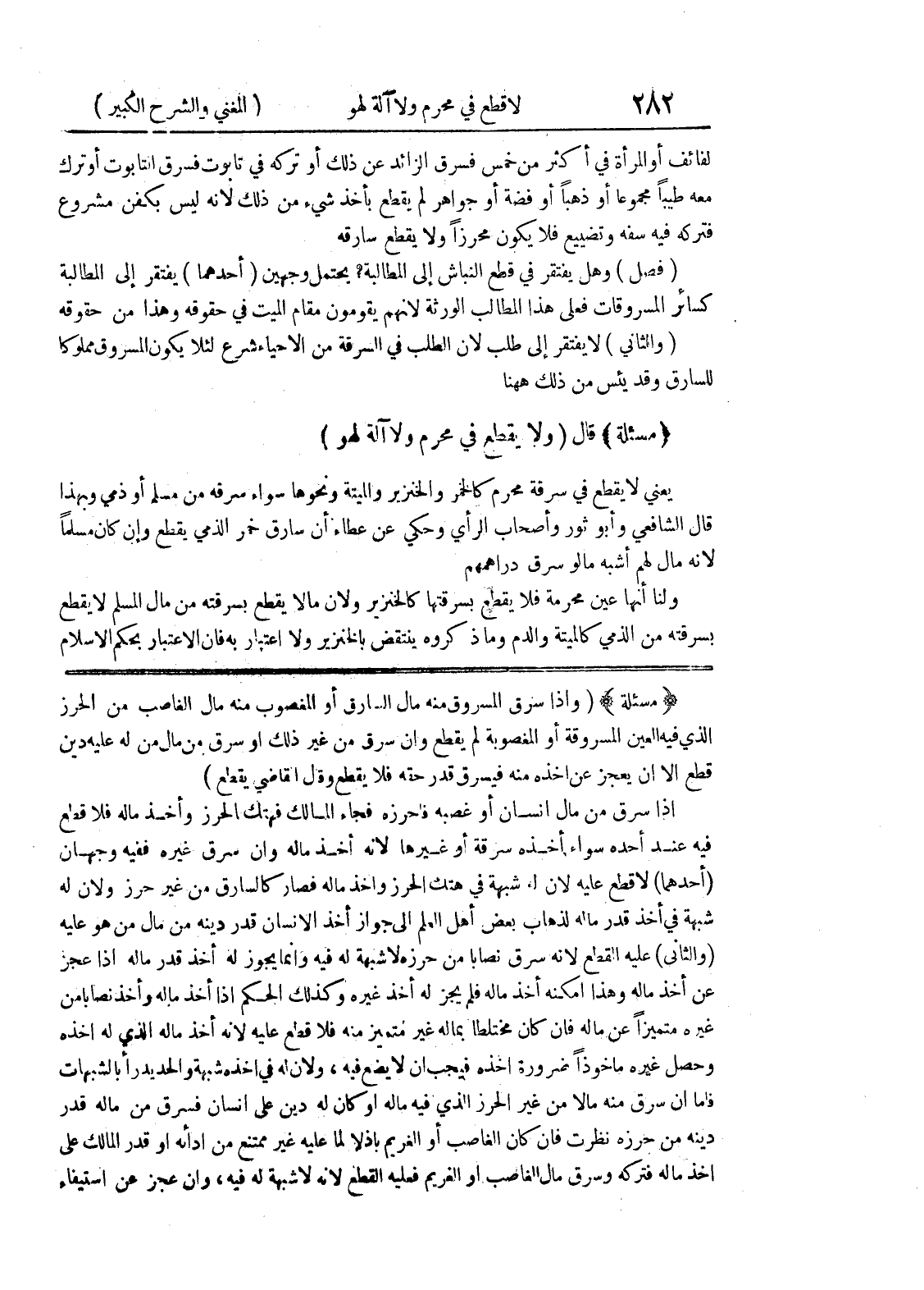 (مسألة) (وإذا سرق المسروق منه مال السارق أو المغصوب منه مال الغاصب من الحرز الذي فيه العين المسروقة أو المغصوبة لم يقطع وإن سرق من غير ذلك أو سرق من مال من له عليه دين قطع إلا أن يعجز عن أخذه منه فيسرق قدر حقه فلا يقطع وقال القاضي يقطع) إذا سرق من مال إنسان أو غصبه فأحرزه فجاء المالك فهتك الحرز وأخذ ماله فلا قطع فيه عند أحده سواء أخذه سرقة أو غيرها لأنه أخذ ماله وإن سرق غيره ففيه وجهان (أحدهما) لا قطع عليه لأن له شبهة في هتك الحرز وأخذ ماله فصار كالسارق من غير حرز ولأن له شبهة في أخذ قدر ماله لذهاب بعض أهل العلم إلى جواز أخذ الانسان قدر دينه من مال من هو عليه (والثاني) عليه القطع لأنه سرق نصاباً من حرزه لاشبهة له فيه وإنما يجوز له أخذ قدر ماله إذا عجز عن أخذ ماله وهذا أمكنه أخذ ماله فلم يجز له أخذ غيره وكذلك الحكم إذا أخذ ماله وأخذ نصابا من غيره متميزاً عن ماله فإن كان مختلطاً بماله غير متميز منه فلا قطع عليه لأنه أخذ ماله الذي له أخذه وحصل غيره مأخوذاً ضرورة أخذه فيجب أن لا يضع فيه، ولأن له في أخذه شبهة والحد يدرأ بالشبهات فأما إن سرق منه مالا من غير الحرز الذي فيه ماله أو كان له دين على إنسان فسرق من ماله قدر دينه من حرزه نظرت فإن كان الغاصب أو الغريم باذلا لما عليه غير ممتنع من أدائه أو قدر المالك على اخذ ماله فتركه وسرق مال الغاصب أو الغريم فعليه القطع لأنه لا شبهة له فيه، وإن عجز عن استيفاء