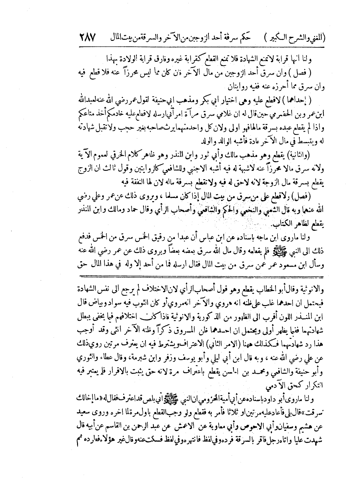 والأنوثية وقال أبو الخطاب يقطع وهو قول أصحاب الرأي لأن الاختلاف لم يرجع إلى نفس الشهادة فيحتمل أن أحدهما غلب على ظنه أنه هروي والآخر أنه مروي أو كان الثوب فيه سواد وبياض قال إبن المنذر اللون أقرب إلى الظهور من الذكورية والأنوثية فإذا كان اختلافهم فيما يخفى يبطل شهادتهما ففيما يظهر أولى ويحتمل أن أحدهما ظن المسروق ذكراً وظنه الآخر انثى وقد أوجب هذا رد شهادتهما فكذلك ههنا (الأمر الثاني) الاعتراف ويشترط فيه أن يعترف مرتين روى ذلك عن علي رضي الله عنه، وبه قال ابن أبي ليلى وأبو يوسف وزفر وابن شبرمة، وقال عطاء والثوري وأبو حنيفة والشافعي ومحمد بن الحسن يقطع باعتراف مرة لأنه حق يثبت بالاقرار فلم يعتبر فيه التكرار كحق الآدمي ولنا ماروى أبو داود بإسناده عن أبي أمية المخزومي أن النبي صلى الله عليه وسلم أتي بلص قد اعترف فقال له (ما إخالك سرقت) قال بلى فأعاد عليه مرتين أو ثلاثا فأمر به فقطع ولو وجب القطع بأول مرة لما أخره وروى سعيد عن هشيم وسفيان وأبي الأحوص وأبي معاوية عن الأعمش عن عبد الرحمن بن القاسم عن أبيه قال شهدت علياً وأتاه رجل فأقر بالسرقة فرده وفي لفظ فانتهره وفي لفظ فسكت عنه وقال غير هؤلاء فطرده ثم