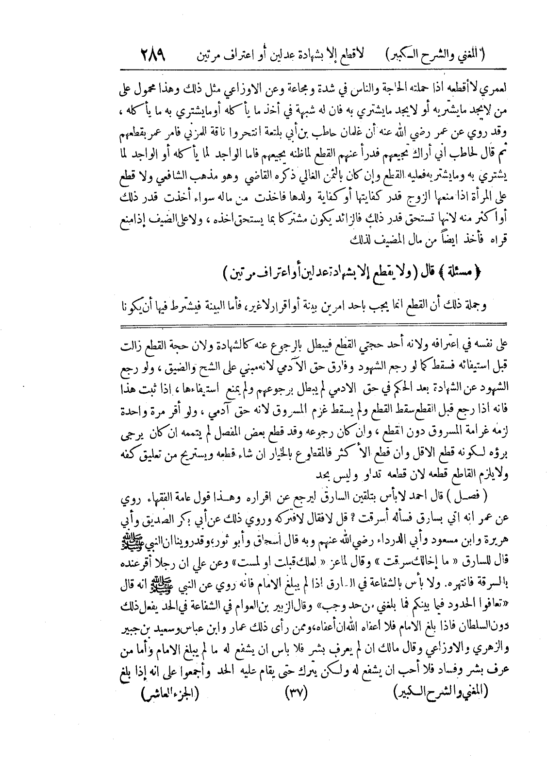 ولا يلزم القاطع قطعه لأن قطعه تداو وليس بحد (فصل) قال أحمد لا بأس بتلقين السارق ليرجع عن إقراره وهذا قول عامة الفقهاء روي عن عمر أنه أتي بسارق فسأله أسرقت؟ قل لا فقال لا فتركه وروي ذلك عن ابي بكر الصديق وأبي هريرة وابن مسعود وأبي الدرداء رضي الله عنهم وبه قال إسحاق وأبو ثور، وقد روينا أن النبي صلى الله عليه وسلم قال للسارق (ما إخالك سرقت) وقال لماعز (لعلك قبلت أو لمست) وعن علي أن رجلا أقر عنده بالسرقة فانتهره.