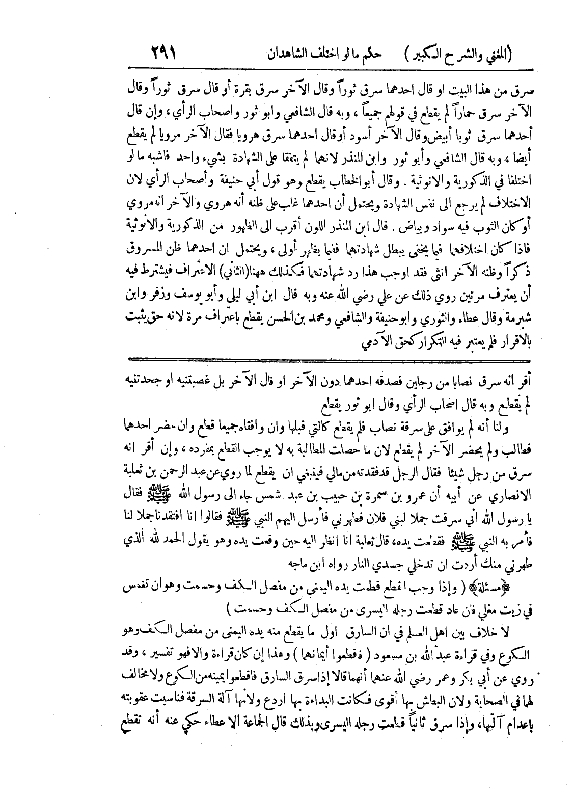 أقر أنه سرق نصابا من رجلين فصدقة أحدهما دون الآخر أو قال الآخر بل غصبتنيه أو جحدتنيه لم يقطع وبه قال أصحاب الرأي وقال أبو ثور يقطع ولنا أنه لم يوافق على سرقة نصاب فلم يقطع كالتي قبلها وإن وافقاه جميعا قطع وإن حضر أحدهما فطالب ولم يحضر الآخر لم يقطع لأن ما حصلت المطالبة به لا يوجب القطع بمفرده، وإن أقر أنه سرق من رجل شيئاً فقال الرجل قد فقدته من مالي فينبغي أن يقطع لما روي عن عبد الرحمن بن ثعلبة الانصاري عن أبيه أن عمرو بن سمرة بن حبيب بن عبد شمس جاء إلى رسول الله صلى الله عليه وسلم فقال يا رسول الله إني سرقت جملا لبني فلان فطهرني فأرسل اليهم النبي صلى الله عليه وسلم فقالوا إنا افتقدنا جملاً لنا فأمر به النبي صلى الله عليه وسلم فقطعت يده، قال ثعلبة أنا أنظر إليه حين وقعت يده وهو يقول الحمد لله الذي طهرني منك أردت أن تدخلي جسدي النار رواه ابن ماجه (مسألة) (وإذا وجب القطع قطعت يده اليمنى من مفصل الكف وحسمت وهو أن تغمس في زيت مغلي فان عاد قطعت رجله اليسرى من مفصل الكف وحسمت) لا خلاف بين أهل العلم في أن السارق أول ما يقطع منه يده اليمنى من مفصل الكف وهو الكوع وفي قراءة عبد الله بن مسعود (فاقطعوا أيمانهما) وهذا إن كان قراءة وإلا فهو تفسير، وقد روي عن ابي بكر وعمر رضي الله عنهما أنهما قالا إذا سرق السارق فاقطعوا يمينه من الكوع ولا مخالف