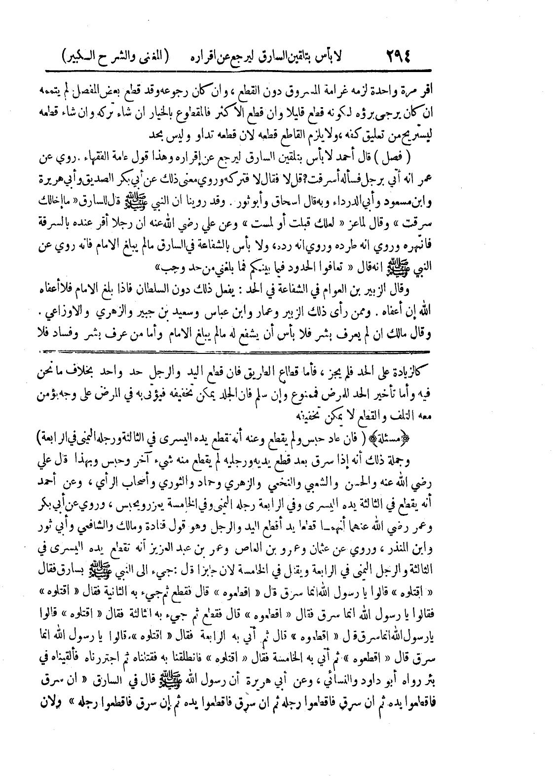 وابن المنذر، وروي عن عثمان وعمرو بن العاص وعمر بن عبد العزيز أنه تقطع يده اليسرى في الثالثة والرجل اليمنى في الرابعة ويقتل في الخامسة لأن جابرا قال: جئ إلى النبي صلى الله عليه وسلم بسارق فقال (اقتلوه) قالوا يا رسول الله انما سرق قال (اقطعوه) قال فقطع ثم جئ به الثانية فقال (اقتلوه) فقالوا يا رسول الله انما سرق فقال (اقطعوه) قال فقطع ثم جئ به الثالثة فقال (اقتلوه) قالوا يارسول الله انما سرق قال (اقطعوه) قال ثم أتي به الرابعة فقال (اقتلوه) ، قالوا يا رسول الله انما سرق قال (اقطعوه) ثم أتي به الخامسة فقال (اقتلوه) فانطلقنا به فقتلناه ثم اجتررناه فألقيناه في بئر رواه أبو داود والنسائي، وعن أبي هريرة أن رسول الله صلى الله عليه وسلم قال في السارق (إن سرق فاقطعوا يده ثم ان سرق فاقطعوا رجله ثم إن سرق فاقطعوا يده ثم ان سرق فاقطعوا رجله) ولأن