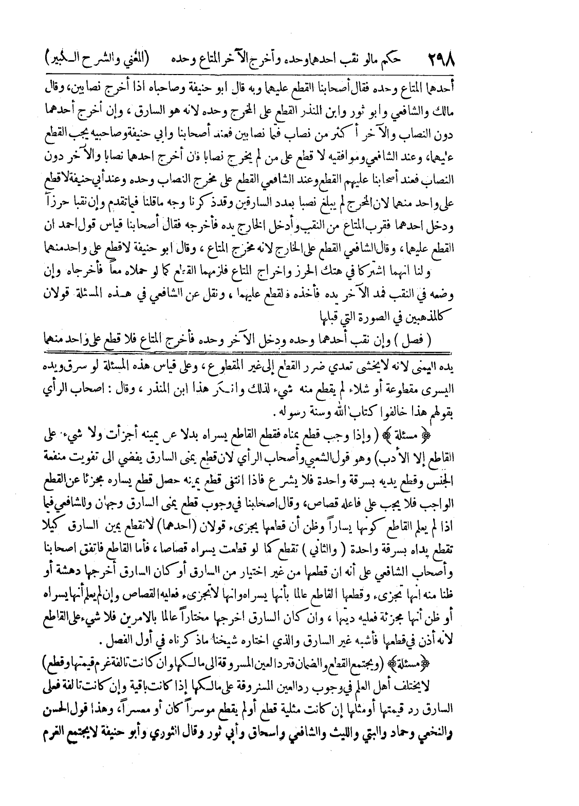 (مسألة) (وإذا وجب قطع يمناه فقطع القاطع يسراه بدلاً عن يمينه أجزأت ولا شئ على القاطع إلا الأدب) وهو قول الشعبي وأصحاب الرأي لأن قطع يمنى السارق يفضي الى تفويت منفعة الجنس وقطع يديه بسرقة واحدة فلا يشرع فإذا انتفى قطع يمينه حصل قطع يساره مجزئاً عن القطع الواجب فلا يجب على فاعله قصاص، وقال أصحابنا في وجوب قطع يمنى السارق وجهان وللشافعي فيما إذا لم يعلم القاطع كونها يسار وظن أن قطعها يجزئ قولان (أحدهما) لا تقطع يمين السارق كيلا تقطع يداه بسرقة واحدة (والثاني) تقطع كما لو قطعت يسراه قصاصاً، فأما القاطع فاتفق أصحابنا وأصحاب الشافعي على أنه ان قطعها من غير اختيار من السارق أو كان السارق أخرجها دهشة أو ظناً منه أنها تجزئ وقطعها القاطع عالماً بأنها يسراه وأنها لا تجزئ فعليه القصاص وإن لم يعلم أنها يسراه أو ظن أنها مجزئة فعليه ديتها، وإن كان السارق أخرجها مختاراً عالماً بالامرين فلا شئ على القاطع لأنه أذن في قطعها فأشبه غير السارق والذي اختاره شيخنا ما ذكرناه في أول الفصل.