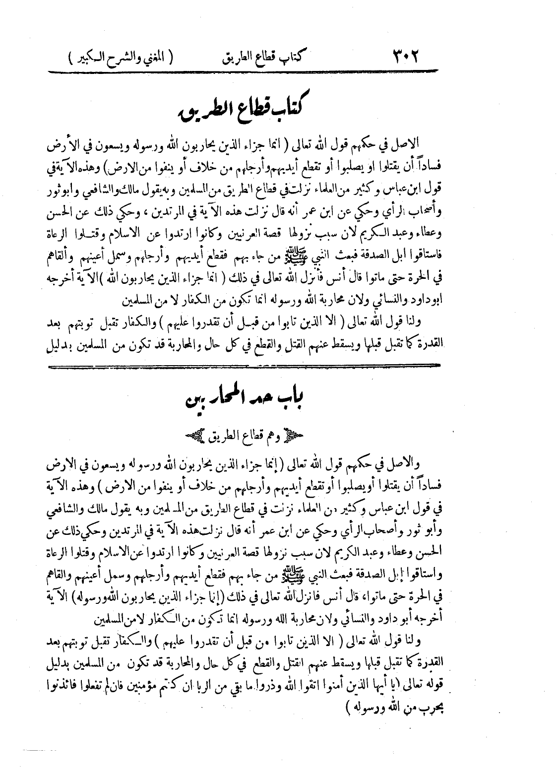 باب حد المحاربين (وهم قطاع الطريق) والأصل في حكمهم قول الله تعالى (إنما جزاء الذين يحاربون الله ورسوله ويسعون في الأرض فسادا أن يقتلوا أو يصلبوا أو تقطع أيديهم وأرجلهم من خلاف أو ينفوا من الأرض) وهذه الآية في قول ابن عباس وكثير من العلماء نزلت في قطاع الطريق من المسلمين وبه يقول مالك والشافعي