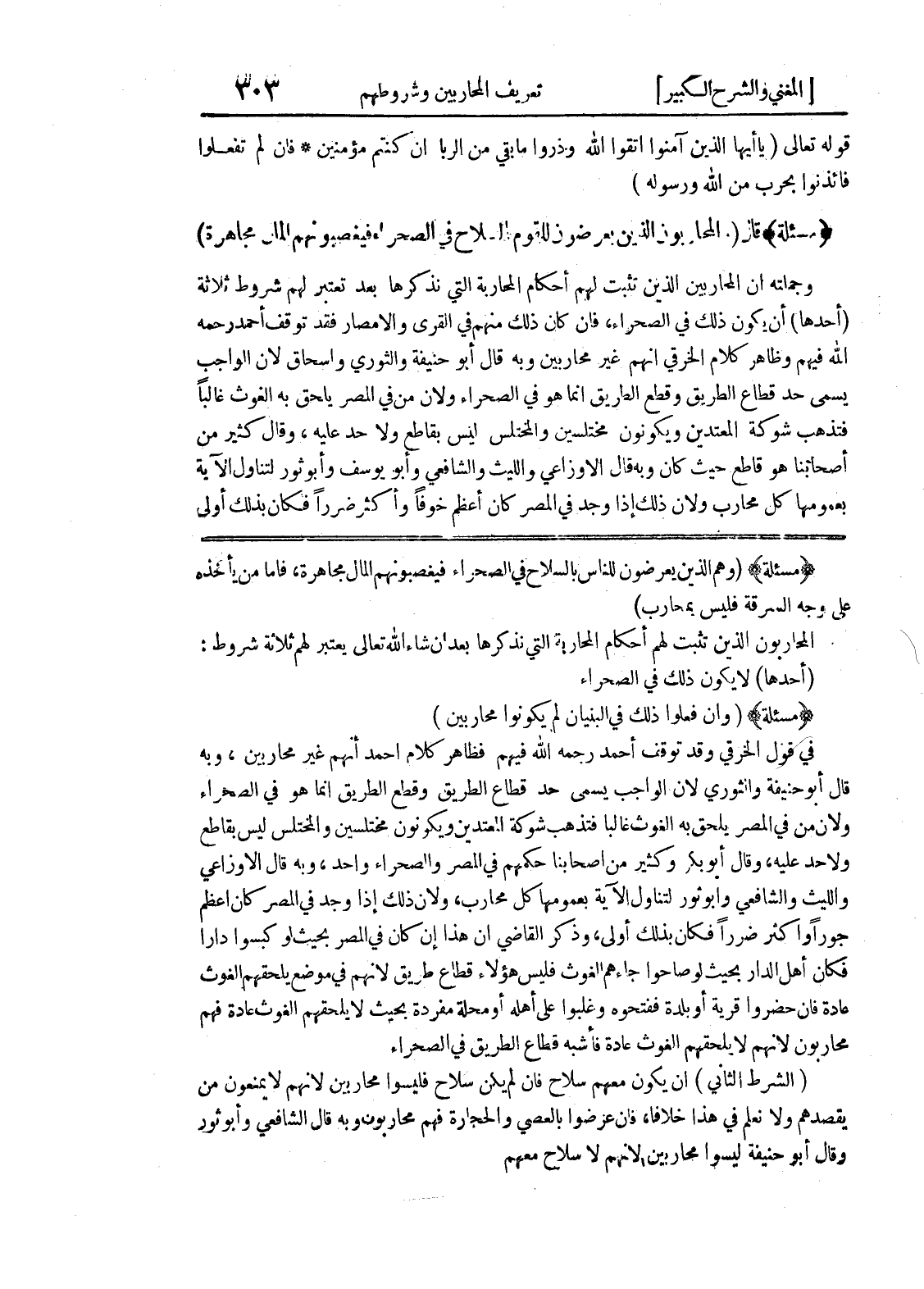 (مسألة) (وهم الذين يعرضون للناس بالسلاح في الصحراء فيغصبونهم المال مجاهرة، فأما من يأخذه على وجه السرقة فليس بمحارب) المحاربون الذين تثبت لهم أحكام المحاربة التي نذكرها بعد إن شاء الله تعالى يعتبر لهم ثلاثة شروط: (أحدها) لا يكون ذلك في الصحراء (مسألة) (وإن فعلوا ذلك في البنيان لم يكونا محاربين) في قول الخرقي وقد توقف أحمد رحمه الله فيهم فظاهر كلام أحمد أنهم غير محاربين، وبه قال أبو حنيفة والثوري لأن الواجب يسمى حد قطاع الطريق وقطع الطريق إنما هو في الصحراء ولان من في المصر يلحق به الغوث غالباً فتذهب شوكة المعتدين ويكونون مختلسين والمختلس ليس بقاطع ولا حد عليه، وقال أبو بكر وكثير من أصحابنا حكمهم في المصر والصحراء واحد، وبه قال الأوزاعي والليث والشافعي وابو ثور لتناول الآية بعمومها كل محارب، ولأن ذلك إذا وجد في المصر كان أعظم جوراً وأكثر ضرراً فكان بذلك أولى، وذكر القاضي أن هذا إن كان في المصر بحيث لو كبسوا دارا فكان أهل الدار بحيث لو صاحوا جاءهم الغوث فليس هؤلاء قطاع طريق لأنهم في موضع يلحقهم الغوث
