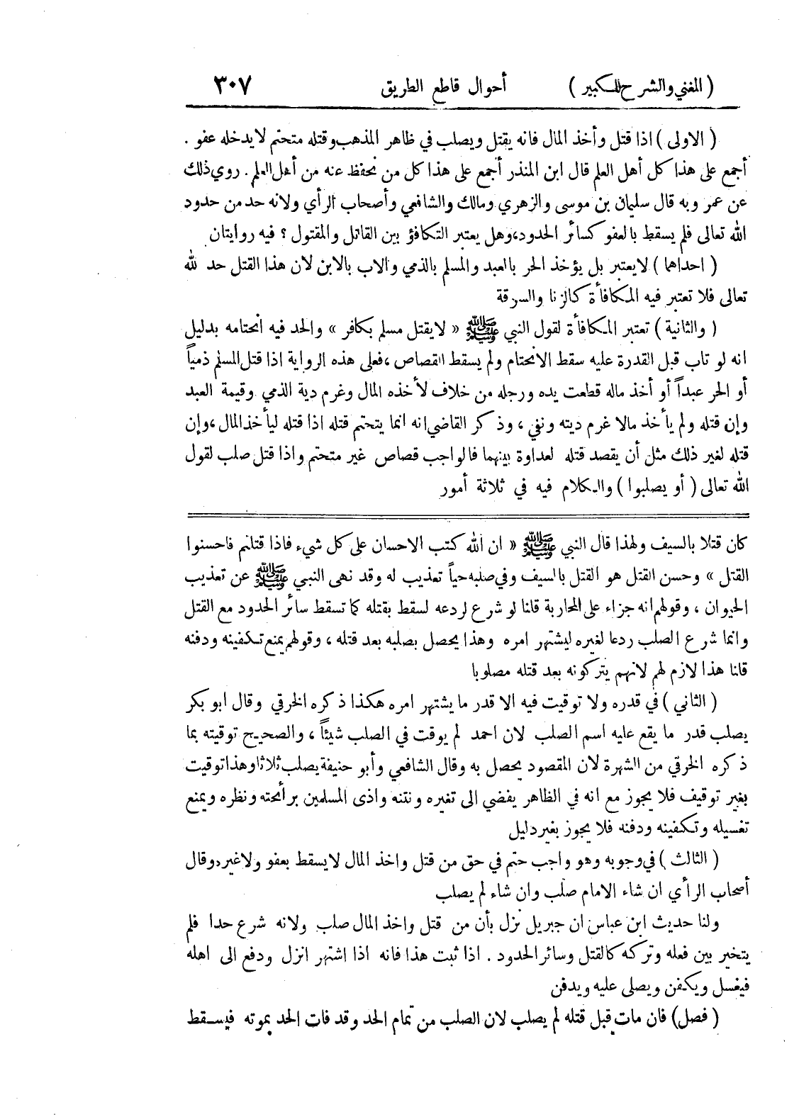 كان قتلاً بالسيف ولهذا قال النبي صلى الله عليه وسلم (ان الله كتب الاحسان على كل شئ فاذا قتلتم فأحسنوا القتل) وحسن القتل هو القتل بالسيف وفي صلبه حياً تعذيب له وقد نهى النبي صلى الله عليه وسلم عن تعذيب الحيوان، وقولهم انه جزاء على المحاربة قلنا لو شرع لردعه لسقط بقتله كما تسقط سائر الحدود مع القتل وإنما شرع الصلب ردعا لغيره ليشتهر أمره وهذا يحصل بصلبه بعد قتله، وقولهم يمنع تكفينه ودفنه قلنا هذا لازم لهم لأنهم يتركونه بعد قتله مصلوباً (الثاني) في قدره ولا توقيت فيه إلا قدر ما يشتهر أمره هكذا ذكره الخرقي وقال أبو بكر يصلب قدر ما يقع عليه اسم الصلب لأن أحمد لم يوقت في الصلب شيئاً، والصحيح توقيته بما ذكره الخرقي من الشهرة لأن المقصود يحصل به وقال الشافعي وابو حنيفة يصلب ثلاثاً وهذا توقيت بغير توقيف فلا يجوز مع أنه في الظاهر يفضي إلى تغيره ونتنه وأذى المسلمين برائحته ونظره ويمنع تغسيله وتكفينه ودفنه فلا يجوز بغير دليل (الثالث) في وجوبه وهو واجب حتم في حق من قتل وأخذ المال لا يسقط بعفو ولا غيره وقال