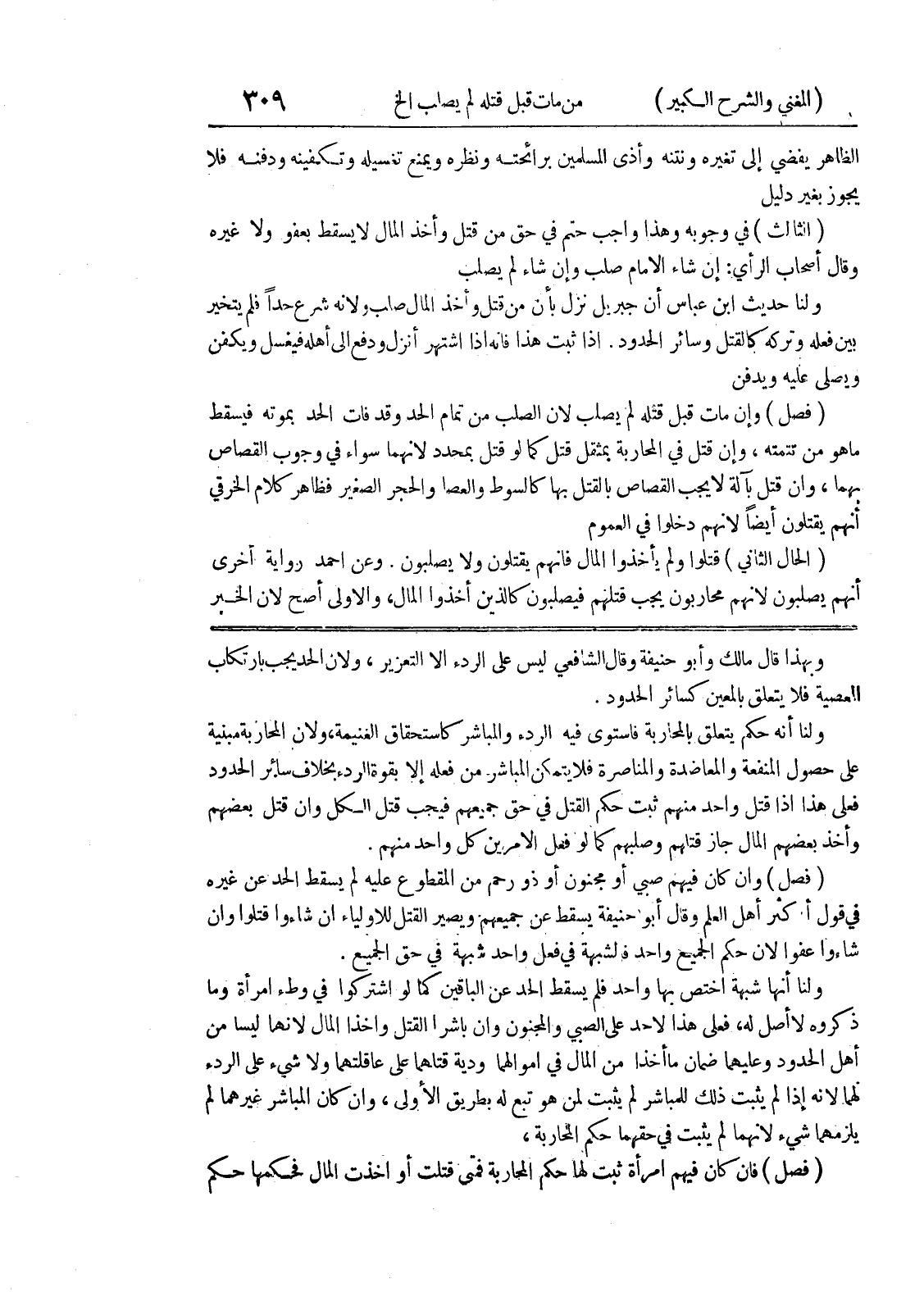 ولنا أنها شبهة اختص بها واحد فلم يسقط الحد عن الباقين كما لو اشتركوا في وطئ امرأة وما ذكروه لا أصل له، فعلى هذا لا حد على الصبي والمجنون وإن باشرا القتل وأخذا المال لأنهما ليسا من أهل الحدود وعليهما ضمان ما أخذا من المال في اموالهما ودية قتلهما على عاقلتهما ولا شئ على الردء لهما لأنه إذا لم يثبت ذلك للمباشر لم يثبت لمن هو تبع له بطريق الأولى، وإن كان المباشر غيرهما لم يلزمهما شئ لأنهما لم يثبت في حقهما حكم المحاربة، (فصل) فإن كان فيهم امرأة ثبت لها حكم المحاربة فمتى قتلت أو أخذت المال فحكمها حكم
