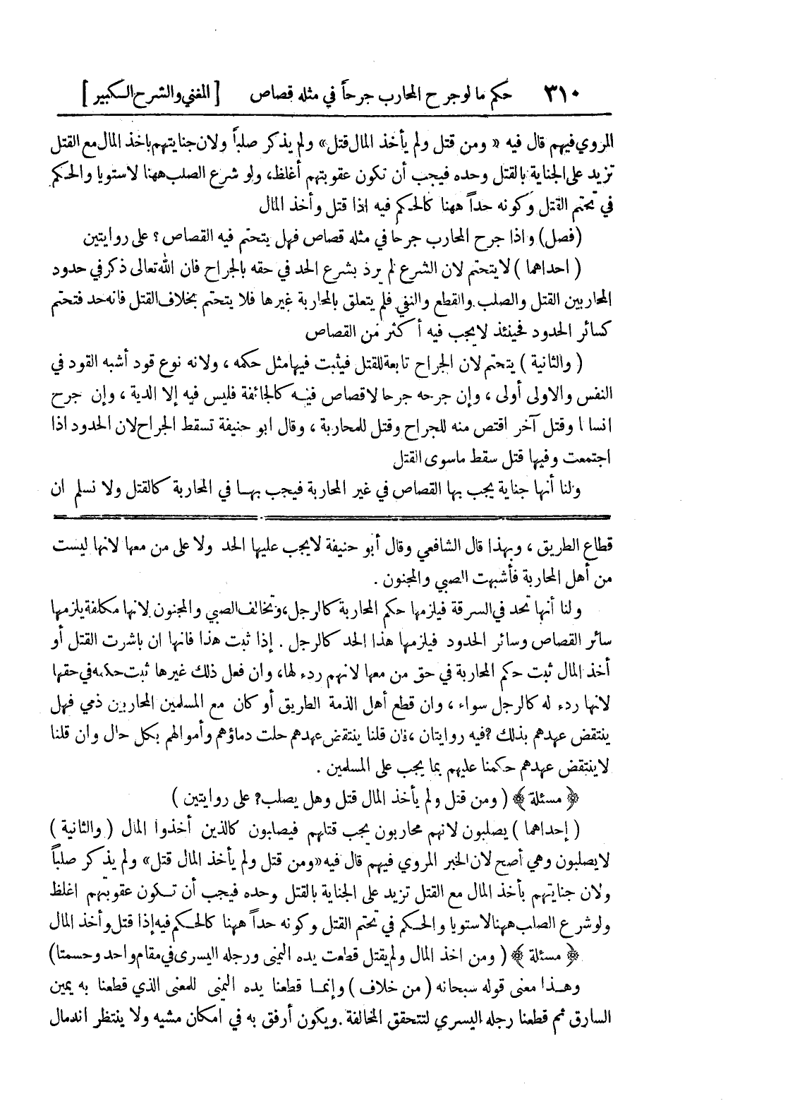 (مسألة) (ومن قتل ولم يأخذ المال قتل وهل يصلب؟ على روايتين) (إحداهما) يصلبون لأنهم محاربون يجب قتلهم فيصلبون كالذين أخذوا المال (والثانية) لا يصلبون وهي أصح لأن الخبر المروي فيهم قال فيه (ومن قتل ولم يأخذ المال قتل) ولم يذكر صلباً ولأن جنايتهم بأخذ المال مع القتل تزيد على الجناية بالقتل وحده فيجب أن تكون عقوبتهم أغلظ ولو شرع الصلب ههنا لاستويا والحكم في تحتم القتل وكونه حداً ههنا كالحكم فيه إذا قتل وأخذ المال (مسألة) (ومن أخذ المال ولم يقتل قطعت يده اليمنى ورجله اليسرى في مقام واحد وحسمتا) وهذا معنى قوله سبحانه (من خلاف) وإنما قطعنا يده اليمنى للمعنى الذي قطعنا به يمين السارق ثم قطعنا رجله اليسرى لتتحقق المخالفة.