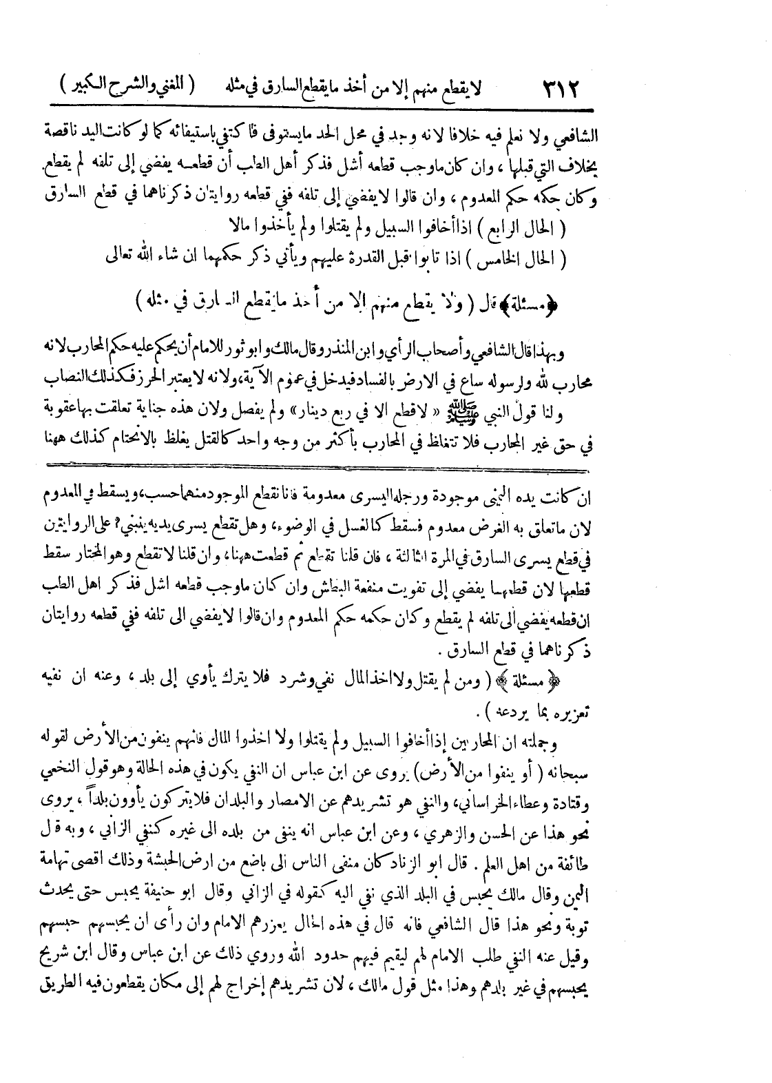 وجملته أن المحاربين إذا أخافوا السبيل ولم يقتلوا ولا أخذوا المال فانهم ينفون من الأرض لقوله سبحانه (أو ينفوا من الأرض) يروي عن ابن عباس أن النفي يكون في هذا الحالة وهو قول النخعي وقتادة وعطاء الخراساني والنفي هو تشريدهم عن الامصار والبدان فلا يتركون يأوون بلداً، يروى نحو هذا عن الحسن والزهري وعن ابن عباس أنه ينفى من بلده الى غيره كنفي الزاني، وبه قال طائفة من أهل العلم.