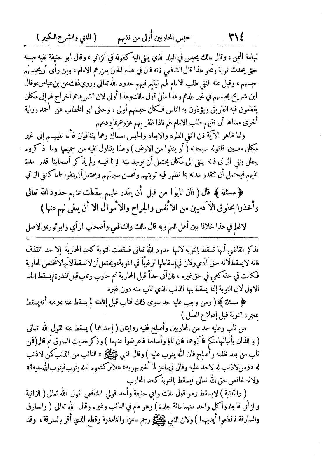 فذكر القاضي أنها تسقط بالتوبة لأنها حدود الله تعالى فسقطت التوبة كحد المحاربة إلا حد القذف فإنه لا يسقط لأنه حق آدمي ولأن في إسقاطها ترغيباً في التوبة، ويحتمل أن لا تسقط لأنها لا تختص المحاربة فكانت في حقه كهي في حق غيره، فان أتى حداً قبل المحاربة ثم حارب وتاب قبل القدرة لم يسقط الحد الأول لأن التوبة إنما يسقط بها الذنب الذي تاب منه دون غيره (مسألة) (ومن وجب عليه حد سوى ذلك فتاب قبل إقامته لم يسقط عنه، وعنه أنه يسقط
