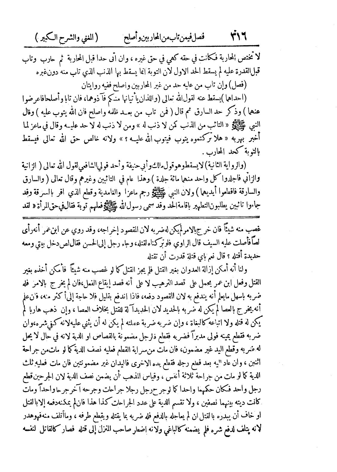 غصب منه شيئاً فان خرج بالأمر لم يكن له ضربه لأن المقصود إخراجه، وقد روي عن ابن عمر أنه رأى لصاً فأصلت عليه السيف قال الراوي فلو تركناه لقتله، وجاء رجل إلى الحسن فقال لص دخل يبتي ومعه حديدة أقتله؟ قال نعم بأي قتلة قدرت أن تقتله ولنا أنه أمكن إزالة العدوان بغير القتل فلم يجز القتل كما لو غصب منه شيئاً فأمكن أخذه بغير القتل وفعل ابن عمر يحمل على قصد الترهيب لا على أنه قصد إيقاع الفعل، فان لم يخرج بالامر فله ضربه بأسهل ما يعلم أنه يندفع به لان المقصود دفعه، فإذا اندفع بقليل فلا حاجة الى أكثر منه، فان علم أنه يخرج بالعصا لم يكن له ضربه بالحديد لأن الحديد آلة للقتل بخلاف العصا، وإن ذهب هارباً لم يكن له قتله ولا اتباعه كالبغاة، وإن ضربه ضربة عصلته لم يكن له أن يثني عليه لأنه كفى شره، وإن ضربه فقطع يمينه فولى مدبراً فضربه فقطع فالرجل مضمونة بالقصاص أو الدية لانه في حال لا يحل له ضربه وقطع اليد غير مضمون، فإن مات من سراية القطع فعليه نصف الدية كما لو مات من جراحة اثنين، وإن عاد إليه بعد قطع رجله فقطع يده الاخرى فاليدان غير مضمونتين فان مات فعليه ثلث الدية كما لو مات من جراحة ثلاثة أنفس، وقياس المذهب أن يضمن نصف الدية لأن الجرحين قطع رجل واحد فكان حكمهما واحداً كما لو جرح رجل رجلا جراحات وجرحه آخر جرحا واحداً ومات كانت ديته بينهما نصفين، ولا تقسم الدية على عدد الجراحات كذا هذا فان لم يمكنه دفعه إلا بالقتل أو خاف أن يبدره بالقتل إن لم يعاجله بالدفع فله ضربه بما يقتله ويقطع طرفه، وما أتلف منه فهو هدر لأنه يتلف لدفع شره فلم يضمنه كالباغي ولأنه اضطر صاحب المنزل إلى قتله فصار كالقاتل لنفسه