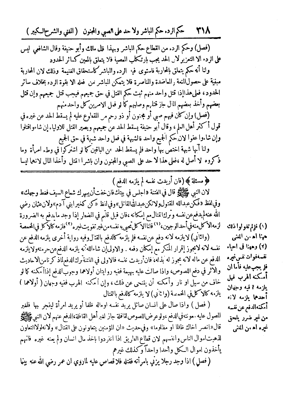 والأولى إن شاء الله أنه يلزمه الدفع عن حرمته ولا يلزمه الدفع عن ماله لأنه يجوز له بذله، فان أريدت نفسه فالأولى في الفتنة ترك الدفع لما ذكرنا من الاحاديث والأثر في دفع اللصوص، وإذا صالت عليه بهيمة ففيه روايتان أولاهما وجوب الدفع إذا أمكنه كما لو خاف من سيل أو نار وأمكنه أن يتنحى عن ذلك، وإن أمكنه الهرب ففيه وجهان (أولاهما) يلزمه كالأكل في المخمصة (والثاني) لا يلزمه كالدفع بالقتال (فصل) وإذا صال على إنسان صائل يريد نفسه أو ماله ظلماً أو يريد امرأة ليفجر بها فلغير المصول عليه معونته في الدفع، ولو عرض اللصوص لقافلة جاز لغير أهل القافلة، الدفع عنهم لأن النبي صلى الله عليه وسلم قال (انصر أخاك ظالماً أو مظلوماً) وفي حديث (إن المؤمنين يتعاونون على القتال) ولأنه لولا التعاون لذهبت اموال الناس وأنفسهم لأن قطاع الطريق إذا انفردوا بأخذ مال إنسان ولم يعنه غيره فانهم يأخذون أموال الكل واحداً واحداً وكذلك غيرهم (فصل) إذا وجد رجلا يزني بامرأته فقتله فلا قصاص عليه لما روي أن عمر رضي الله عنه بينما