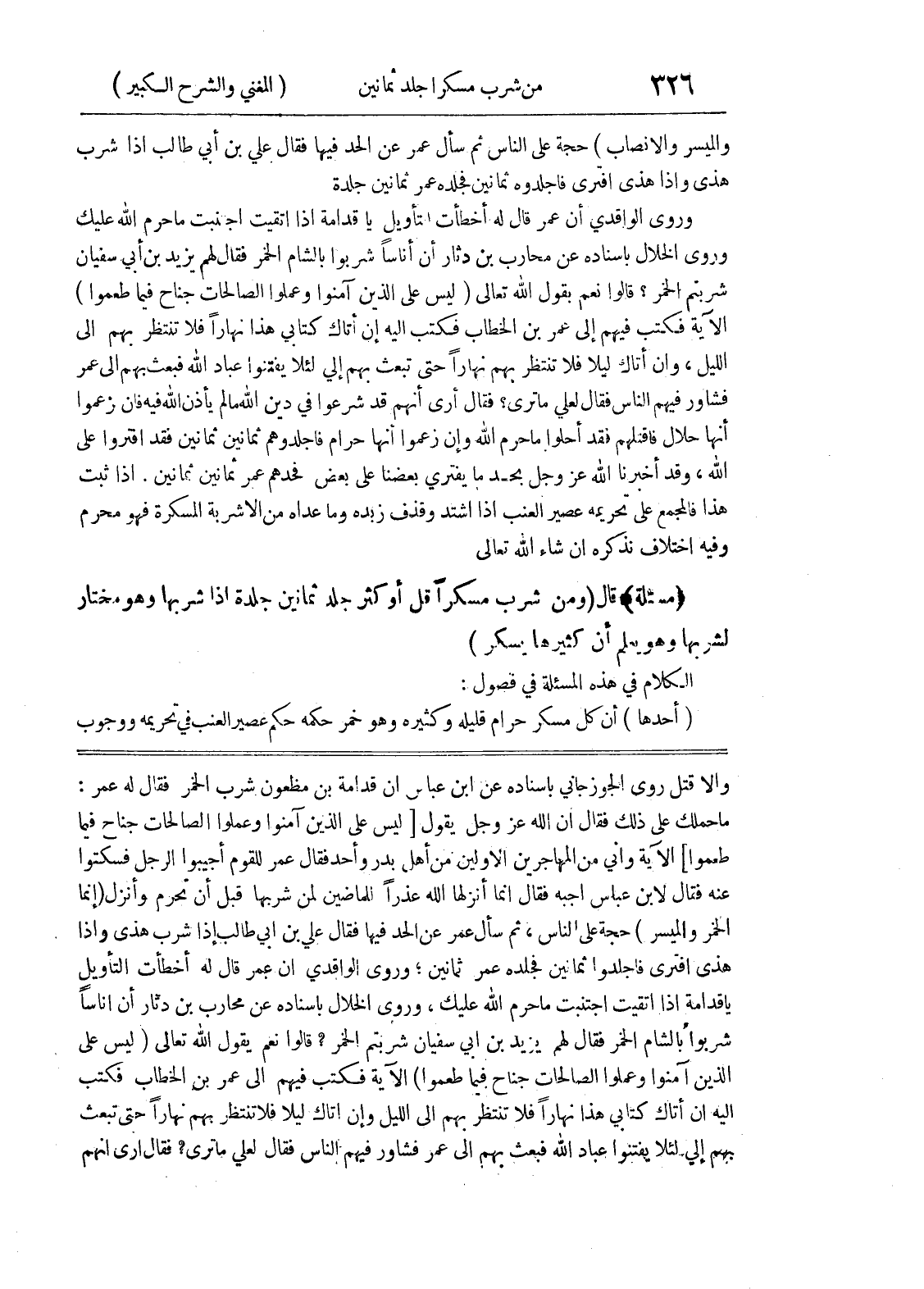 وإلا قتل روى الجوزجاني بإسناده عن ابن عباس أن قدامة بن مظعون شرب الخمر فقال له عمر: ما حملك على ذلك فقال إن الله عزوجل يقول [ليس على الذين آمنوا وعملوا الصالحات جناح فيما طعموا] الآية وإني من المهاجرين الأولين من أهل بدر وأحد فقال عمر للقوم أجيبوا الرجل فسكتوا عنه فقال لابن عباس أجبه فقال إنما أنزلها الله عذراً للماضين لمن شربها قبل أن تحرم وأنزل (إنما الخمر والميسر) حجة على الناس، ثم سأل عمر عن الحد فيها فقال علي بن أبي طالب إذا شرب هذي وإذا هذى افترى فاجلدوا ثمانين فجلده عمر ثمانين: وروى الواقدي أن عمر قال له أخطأت التأويل يا قدامة إذا اتقيت اجتنبت ما حرم الله عليك، وروى الخلال بإسناده عن محارب بن دثار أن اناساً شربوا بالشام الخمر فقال لهم يزيد بن أبي سفيان شربتم الخمر؟ قالوا نعم يقول الله تعالى (ليس على الذين آمنوا وعملوا الصالحات جناح فيما طعموا) الآية فكتب فيهم إلى عمر بن الخطاب فكتب إليه إن أتاك كتابي هذا نهاراً فلا تنتظر بهم إلى الليل وإن أتاك ليلاً فلا تنتظر بهم نهاراً حتى تبعث بهم إلي لئلا يفتنوا عباد الله فبعث بهم إلى عمر فشاور فيهم الناس فقال لعلي ما ترى؟ فقال أرى أنهم