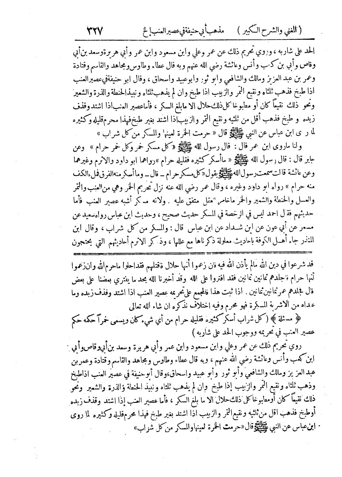 ابن كعب وأنس وعائشة رضي الله عنهم، وبه قال عطاء وطاوس ومجاهد والقاسم وقتادة وعمر بن عبد العزيز ومالك والشافعي وأبو ثور وأبو عبيد واسحاق، وقال أبو حنيفة في عصير العنب إذا طبخ وذهب ثلثاه ونقيع التمر والزبيب إذا طبخ وان لم يذهب ثلثاه ونبيذ الحنطة والذرة والشعير ونحو ذلك نقيعاً كان أو مطبوخاً كل ذلك حلال إلا ما بلغ السكر، فأما عصير العنب إذا اشتد وقذف زبده أو طبخ فذهب أقل من ثلثيه ونقيع التمر والزبيب إذا اشتد بغير طبخ فهذا محرم قليله وكثيره لما روى ابن عباس عن النبي صلى الله عليه وسلم قال (حرمت الخمرة لعينها والمسكر من كل شراب)