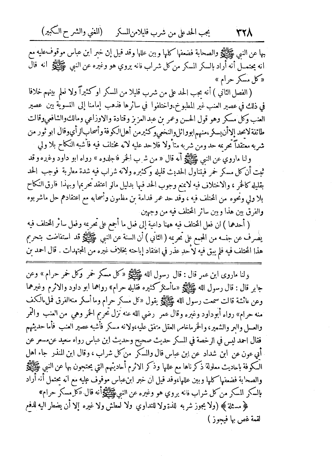 ولنا ماروى ابن عمر قال: قال رسول الله صلى الله عليه وسلم (كل مسكر خمر وكل خمر حرام) وعن جابر قال: قال رسول الله صلى الله عليه وسلم (ما أسكر كثيره فقليله حرام) رواهما أبو داود والاثرم وغيرهما وعن عائشة قالت سمعت رسول الله صلى الله عليه وسلم يقول (كل مسكر حرام وما أسكر منه الفرق فملء الكف منه حرام) رواه أبو داود وغيره وقال عمر رضي الله عنه نزل تحريم الخمر وهي من العنب والتمر والعسل والبر والشعير، والخمر ما خامر العقل متفق عليه، ولأنه مسكر فأشبه عصير العنب فأما حديثهم فقال أحمد ليس في الرخصة في المسكر حديث صحيح وحديث ابن عباس رواه سعيد عن مسعر عن أبي عون عن ابن شداد عن ابن عباس قال والمسكر من كل شراب، وقال ابن المنذر جاء أهل الكوفة بأحاديث معلولة ذكرناها مع عللها وذكر الأثرم أحاديثهم التي يحتجون بها عن النبي صلى الله عليه وسلم والصحابة فضعفها كلها وبين عللها، وقد قيل إن خبر ابن عباس موقوف عليه مع أنه يحتمل أنه أراد بالسكر المسكر من كل شراب فإنه يروي هو وغيره عن النبي صلى الله عليه وسلم انه قال (كل مسكر حرام) (مسألة) (ولا يجوز شربه للذة ولا للتداوي ولا لعطش ولا غيره إلا أن يضطر إليه لدفع لقمة غص بها فيجوز)
