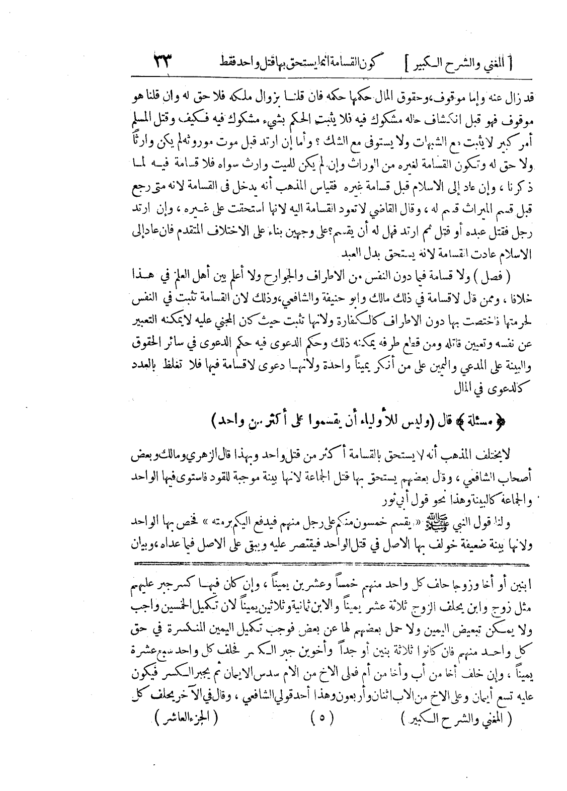 ابنين أو أخا وزوجا حلف كل واحد منهم خمساً وعشرين يمينا، وإن كان فيها كسر جبر عليهم مثل زوج وابن يحلف الزوج ثلاثة عشر يميناً والابن ثمانية وثلاثين يميناً لأن تكميل الخمسين واجب ولا يمكن تبعيض اليمين ولا حمل بعضهم لها عن بعض فوجب تكميل اليمين المنكسرة في حق كل واحد منهم فان كانوا ثلاثة بنين أو جداً وأخوين جبر الكسر فحلف كل واحد سبع عشرة يميناً، وإن خلف أخا من أب وأخا من أم فعلى الأخ من الأم سدس الأيمان ثم يجبر الكسر فيكون عليه تسع أيمان وعلى الأخ من الأب اثنان وأربعون وهذا أحد قولي الشافعي، وقال في الآخر يحلف كل