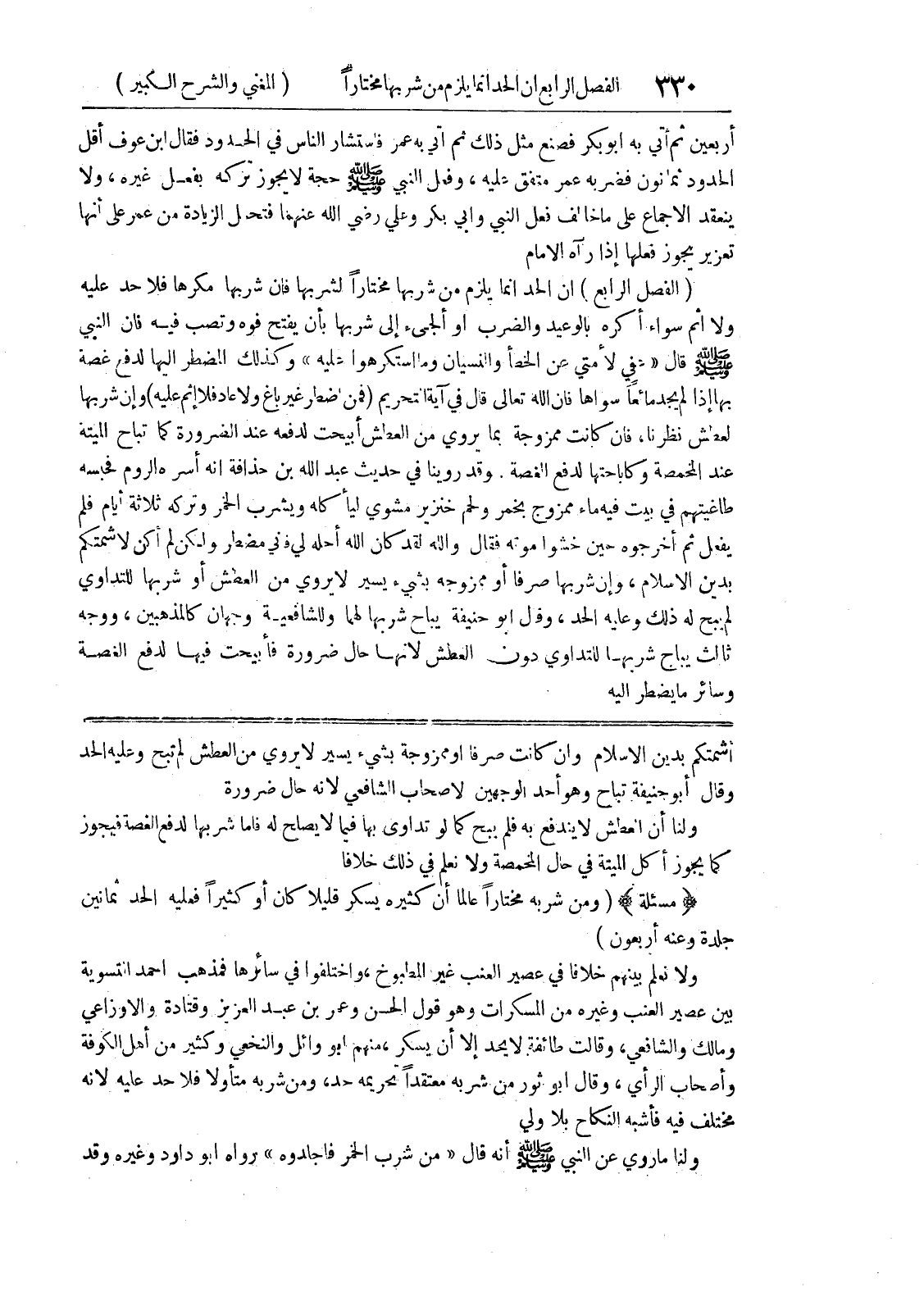 أشمتكم بدين الإسلام وإن كانت صرفاً أو ممزوجة بشئ يسير لا يروي من العطش لم تبح وعليه الحد وقال أبو حنيفة تباح وهو أحد الوجهين لأصحاب الشافعي لأنه حال ضرورة ولنا أن العطش لا يندفع به فلم يبح كما لو تداوى بها فيما لا يصلح له فأما شربها لدفع الغصة فيجوز كما يجوز أكل الميتة في حال المخمصة ولا نعلم في ذلك خلافاً (مسألة) (ومن شربه مختاراً عالماً أن كثيره يسكر قليلاً كان أو كثيراً فعليه الحد ثمانين جلدة وعنه أربعون) ولا نعلم بينهم خلافاً في عصير العنب غير المطبوخ، واختلفوا في سائرها فمذهب أحمد التسوية بين عصير العنب وغيره من المسكرات وهو قول الحسن وعمر بن عبد العزيز وقتادة والاوزاعي ومالك والشافعي، وقالت طائفة لا يحد إلا أن يسكر، منهم أبو وائل والنخعي وكثير من أهل الكوفة وأصحاب الرأي، وقال أبو ثور من شربه معتقداً تحريمه حد، ومن شربه متأولا فلا حد عليه لأنه مختلف فيه فأشبه النكاح بلا ولي ولنا ماروي عن النبي صلى الله عليه وسلم أنه قال (من شرب الخمر فاجلدوه) رواه أبو داود وغيره وقد
