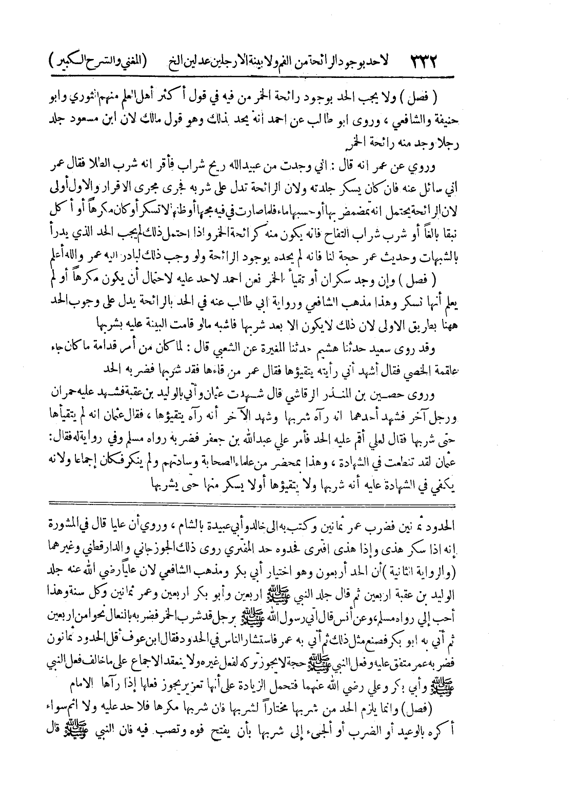 الحدود ثمانين فضرب عمر ثمانين وكتب به إلى خالد وابي عبيدة بالشام، وروي أن عليا قال في المشورة إنه إذا سكر هذى وإذا هذى افترى فحدوه حد المفتري روى ذلك الجوزجاني والدارقطني وغيرهما (والرواية الثانية) أن الحد أربعون وهو اختيار أبي بكر ومذهب الشافعي لأن علياً رضي الله عنه جلد الوليد بن عقبة أربعين ثم قال جلد النبي صلى الله عليه وسلم أربعين وأبو بكر أربعين وعمر ثمانين وكل سنة وهذا أحب إلي رواه مسلم، وعن أنس قال أتي رسول الله صلى الله عليه وسلم برجل قد شرب الخمر فضربه بالنعال نحواً من أربعين ثم أتي به أبو بكر فصنع مثل ذلك ثم أتى به عمر فاستشار الناس في الحدود فقال ابن عوف أقل الحدود ثمانون فضربه عمر متفق عليه وفعل النبي صلى الله عليه وسلم حجة لا يجوز تركه لفعل غيره ولا ينعقد الاجماع على ما خالف فعل النبي صلى الله عليه وسلم وأبي بكر وعلي رضي الله عنهما فتحمل الزيادة على أنها تعزير يجوز فعلها إذا رآها الإمام (فصل) وإنما يلزم الحد من شربها مختاراً لشربها فإن شربها مكرها فلا حد عليه ولا إثم سواء