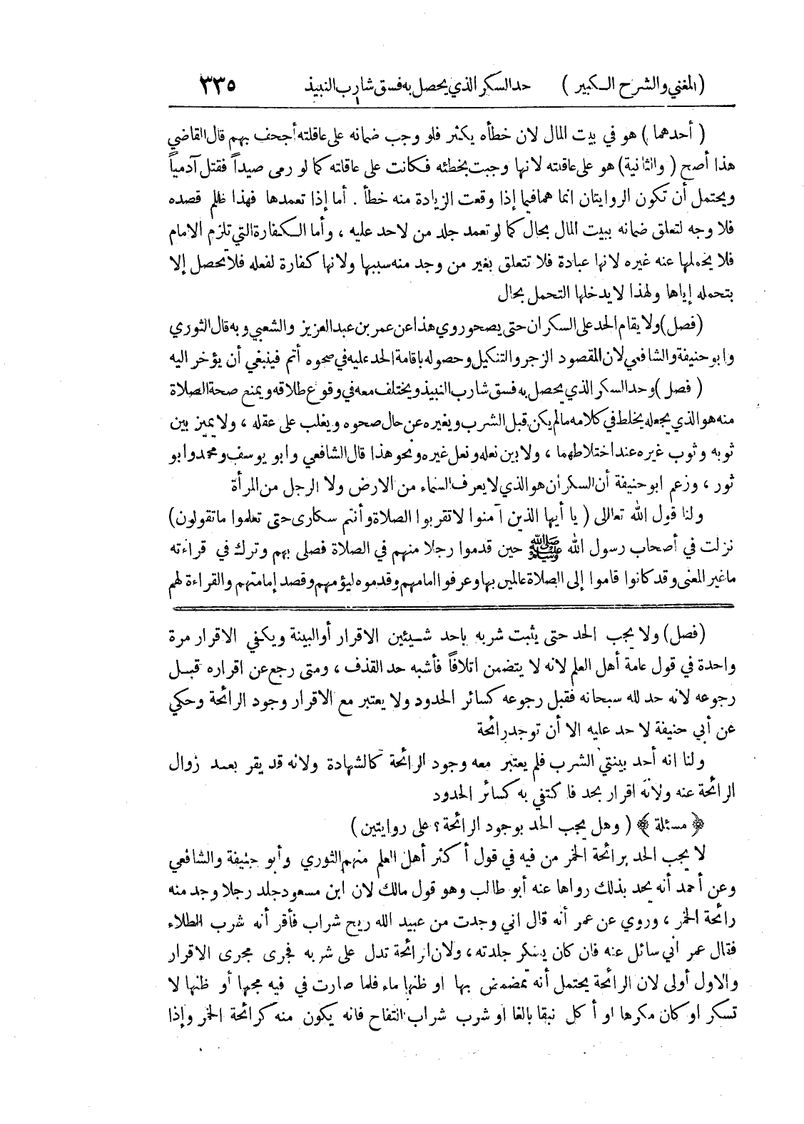 (فصل) ولا يجب الحد حتى يثبت شربه بأحد شيئين الاقرار أو البينة ويكفي الاقرار مرة واحدة في قول عامة أهل العلم لأنه لا يتضمن اتلافا فأشبه حد القذف، ومتى رجع عن إقراره قبل رجوعه لأنه حد لله سبحانه فقبل رجوعه كسائر الحدود ولا يعتبر مع الإقرار وجود الرائحة وحكي عن أبي حنيفة لا حد عليه إلا أن توجد رائحة ولنا أنه أحد بينتي الشرب فلم يعتبر معه وجود الرائحة كالشهادة ولأنه قد يقر بعد زوال الرائحة عنه ولأنه إقرار بحد فاكتفى به كسائر الحدود (مسألة) (وهل يجب الحد بوجود الرائحة؟ على روايتين) لا يجب الحد برائحة الخمر من فيه في قول أكثر أهل العلم منهم الثوري وأبو حنيفة والشافعي وعن أحمد أنه يحد بذلك رواها عنه أبو طالب وهو قول مالك لأن ابن مسعود جلد رجلا وجد منه رائحة الخمر، وروي عن عمر أنه قال إني وجدت من عبيد الله ريح شراب فأقر أنه شرب الطلاء فقال عمر إني سائل عنه فإن كان ينكر جلدته، ولأن الرائحة تدل على شربه فجرى مجرى الإقرار والأول أولى لأن الرائحة يحتمل أنه تمضمض بها أو ظنها ماء فلما صارت في فيه مجها أو ظنها لا تسكر أو كان مكرهاً أو أكل نبقا بالغا أو شرب شراب التفاح فإنه يكون منه كرائحة الخمر وإذا